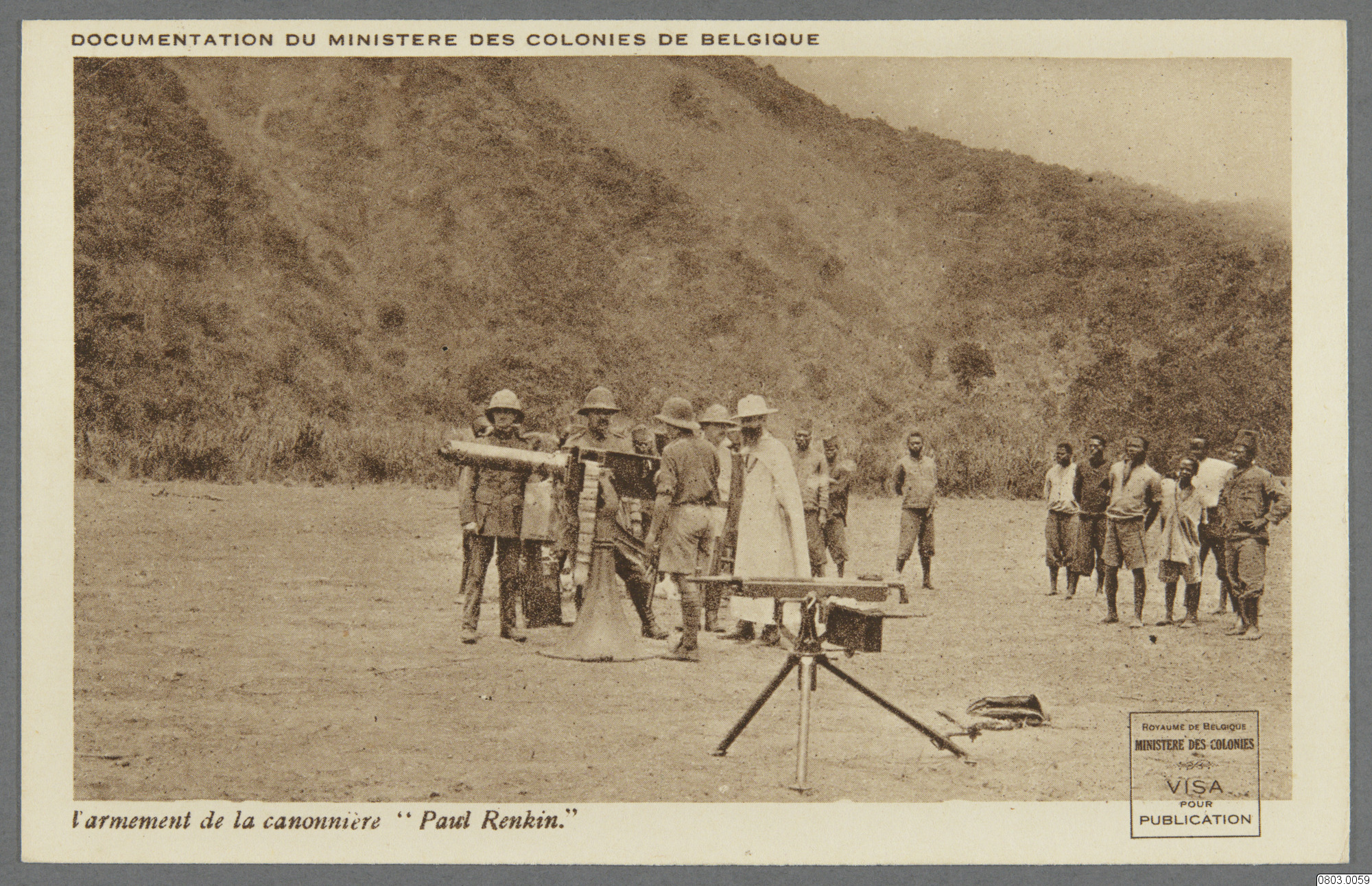 Vykort med motiv av grupp med män, civil- och uniformsklädda stående vid och runt en kulspruta. Text på framsida: "Documentation du Ministere des Colonies de Belgique. Varmement de la canonnière 'Paul Renkin' " Text på baksida: "Carte Postale, Publiée au bénéfice de l'œuvre; "Asiles des soldats invalides Belges. Cabinet de Mr. le Ministre Vandervelde, Ste. Adresse, France (Seine Inférieure). Côte réservé à l'adresse."