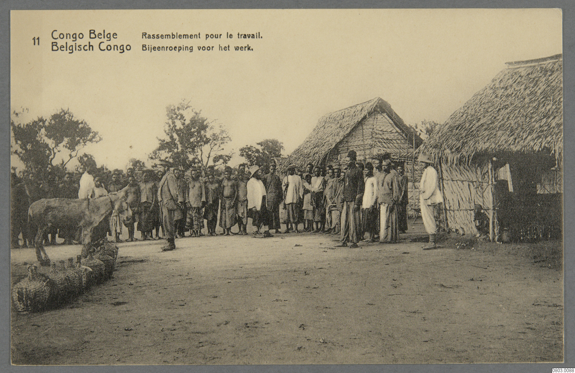 Vykort med motiv av en samling arbetare i möte innan arbete, åsna, krukor, byggnader. Text på framsida: "Congo Belge, Belgisch Congo, Rassemblement pour le travail, Bijeenropeping voor het work." Text på baksida: "Congo Belge, Belgisch Congo, Carte Postale, Postkaart, Correspondance, Briefwisseling, Adresse, Adres."