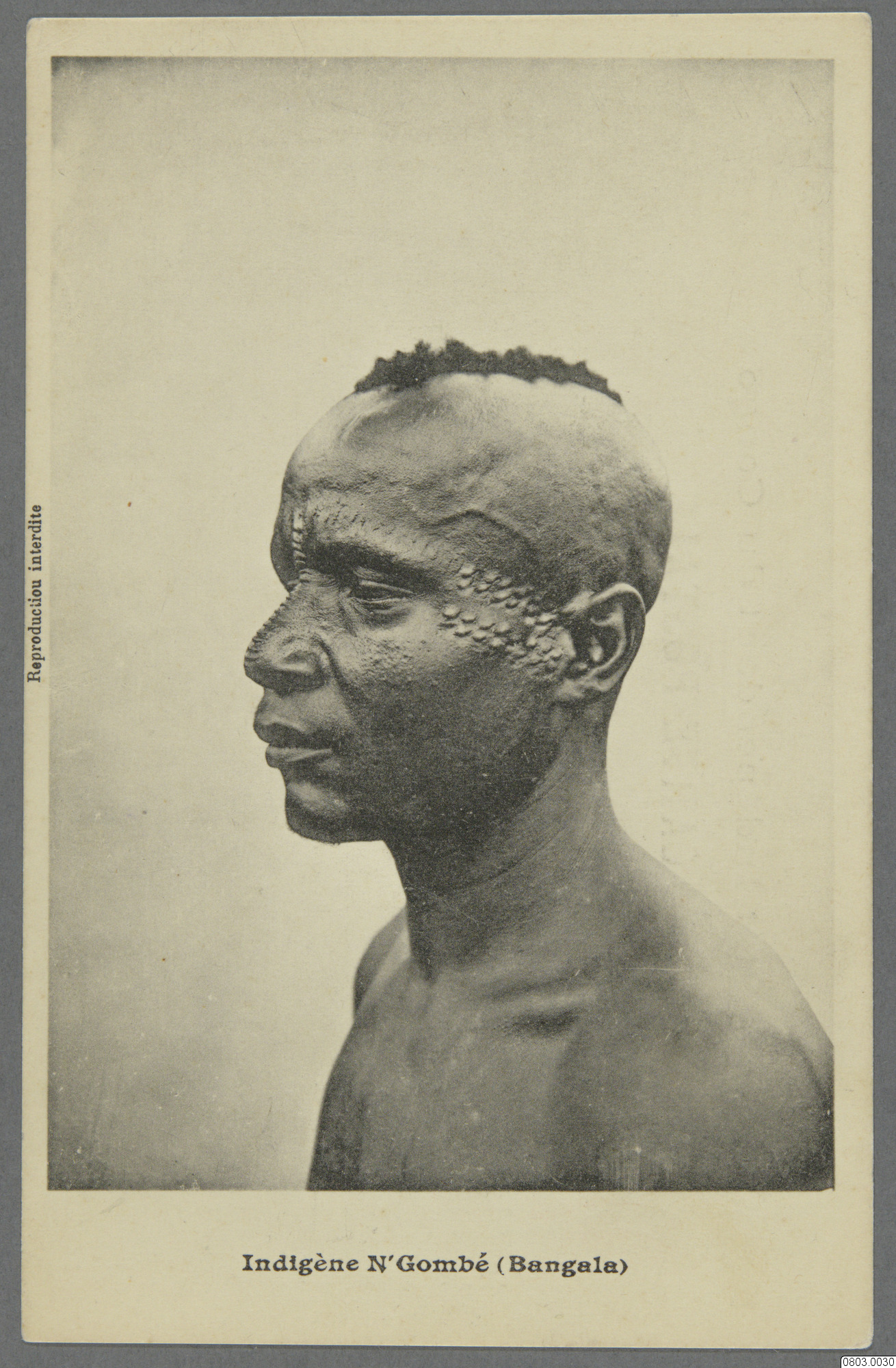 Vykort med ansiktporträtt av en man. Text på framsida: "Indigène N'Gombé (Bangala) Reproduction interdite." Text på baksida: "Etat Independant du Congo. Carte Postale. Correspondance. Adresse"