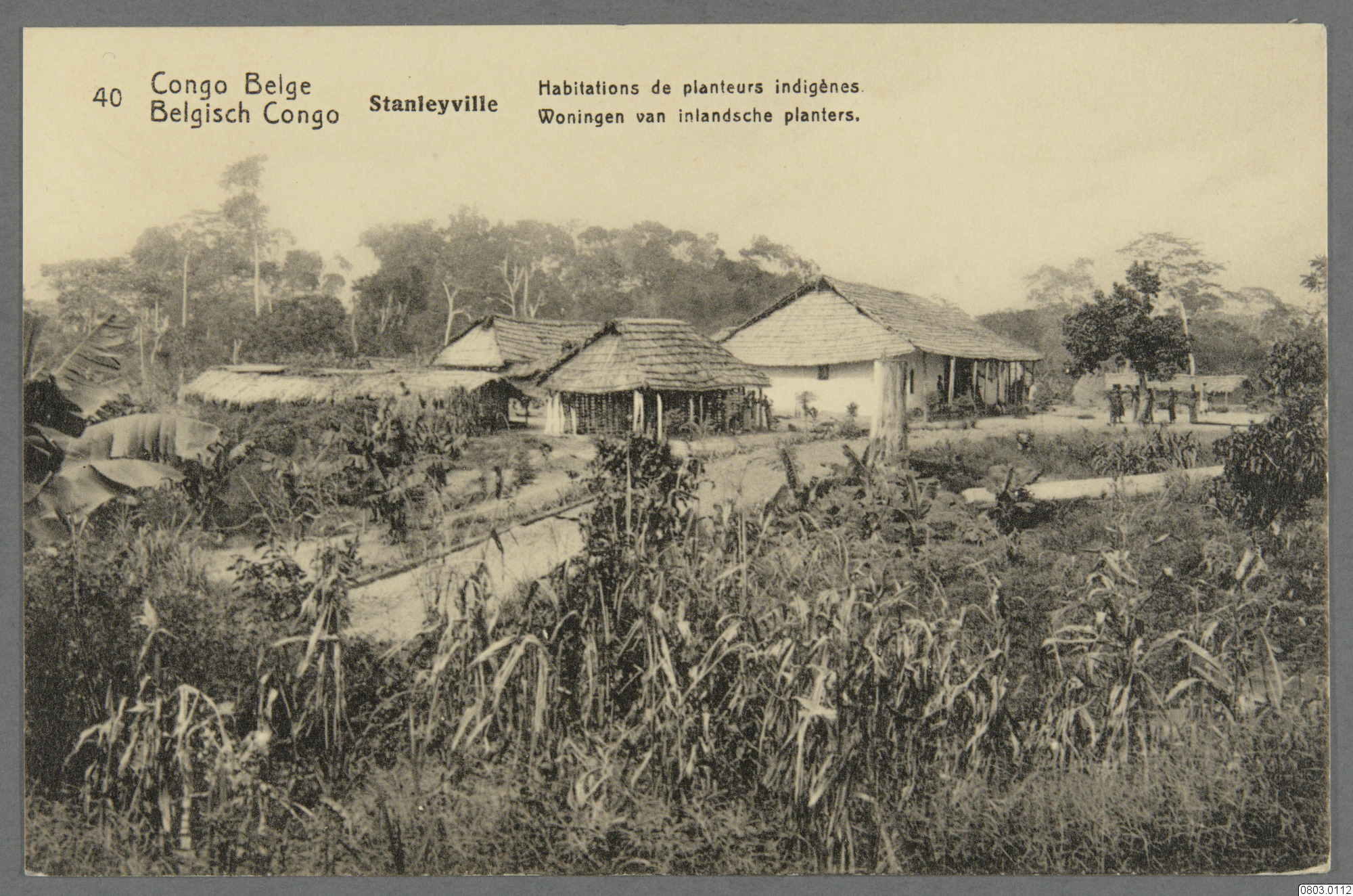 Vykort med motiv av inhemska plantörers bostäder i Kisangi. Text på framsida: "Congo Belge, Belgisch Congo, Stanleyville, Habitations de planteurs indigénes, Woningen van inlandsche planters." Text på baksida: "Congo Belge, Belgisch Congo, Carte Postale, Postkaart, Correspondance, Briefwisseling, Adresse, Adres."