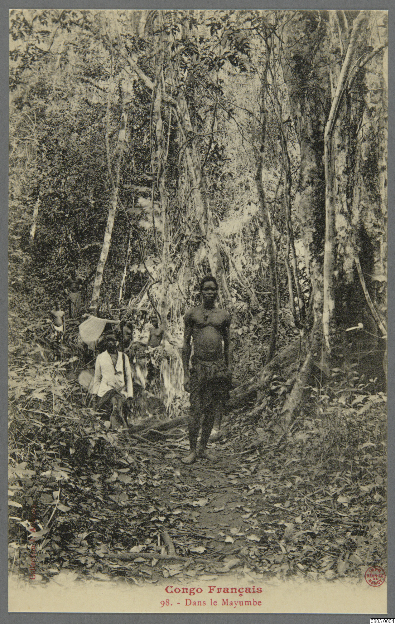 Vykort med motiv av män som kommer gående på stig. Text på framsida: " Congo Francais, 98. Dans le Mayumbe" Text på baksida: "Carte Postale. Correspondance. Adresse"