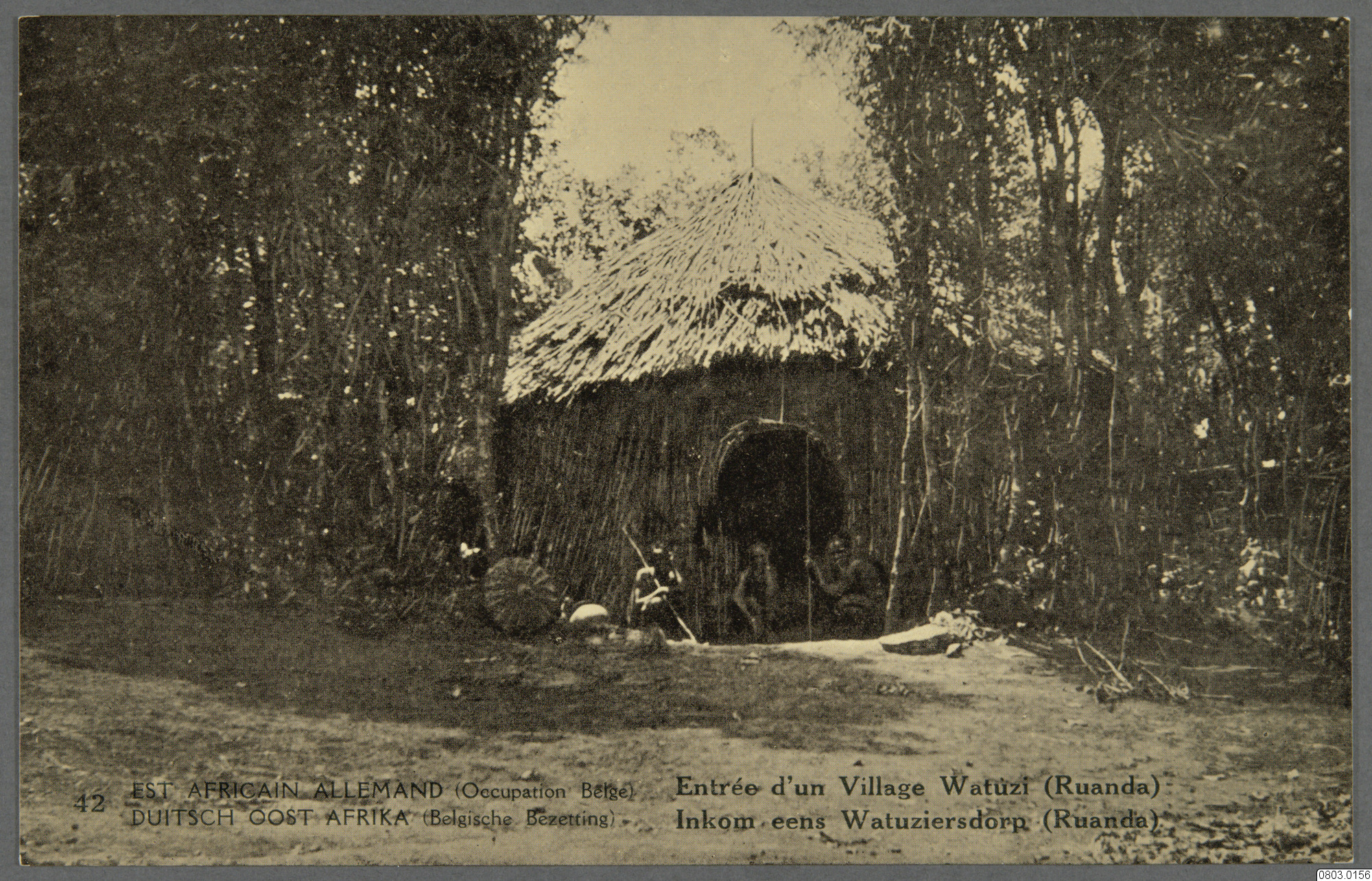 Vykort med motiv av ingång till en Watusiby i Rwanda, urinvånare beväpnade med spjut, en sköld i förgrunden och en byggnad i bakgrunden. Text på framsida: "Est Africain Allemand (Occupation Belge), Dutsch Oost Afrika (Belgische Bezetting), Entrée d'un Village Watuzi (Ruanda), Inkom eens Watuziersdorp (Ruanda)." Text på baksida: "Congo Belge, Belgisch Congo, Carte Postale, Postkaart, Correspondance, Briefwisseling, Adresse, Adres. Waterlow & Sons Limited, Londres, Angleterre."