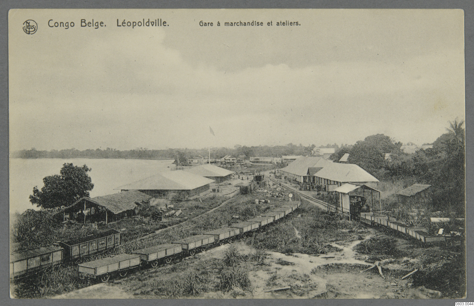Vykort med motiv av stationsområde med verkstäder. Text på framsida: "Congo Belge, Leopoldville. Gare á marchandise et ateliers" Text på baksida: "Carte Postale, Correspondance, Adresse, Ed. Nels, Bruxelles. Collection du Touring Club. serie 14, No. 138."