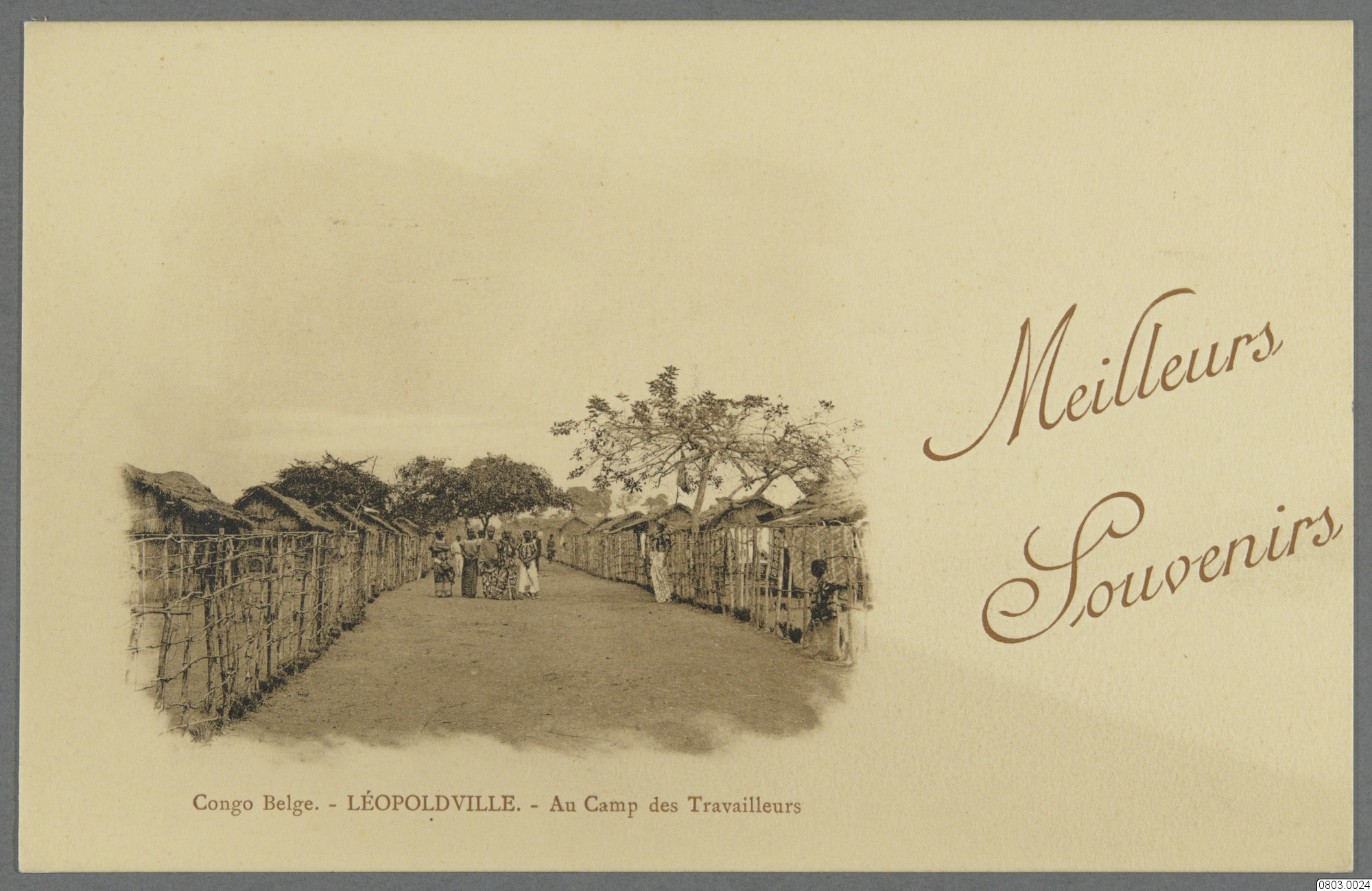 Vykort med motiv av arbetarbostäder-arbetsläger. Text på framsida: "Congo Belge. Leopoldville. Au Camp des Travailleurs. Meilleurs Souvenirs" Text på baksida: "Congo Belge. Carte Postale. Correspondance. Adresse"