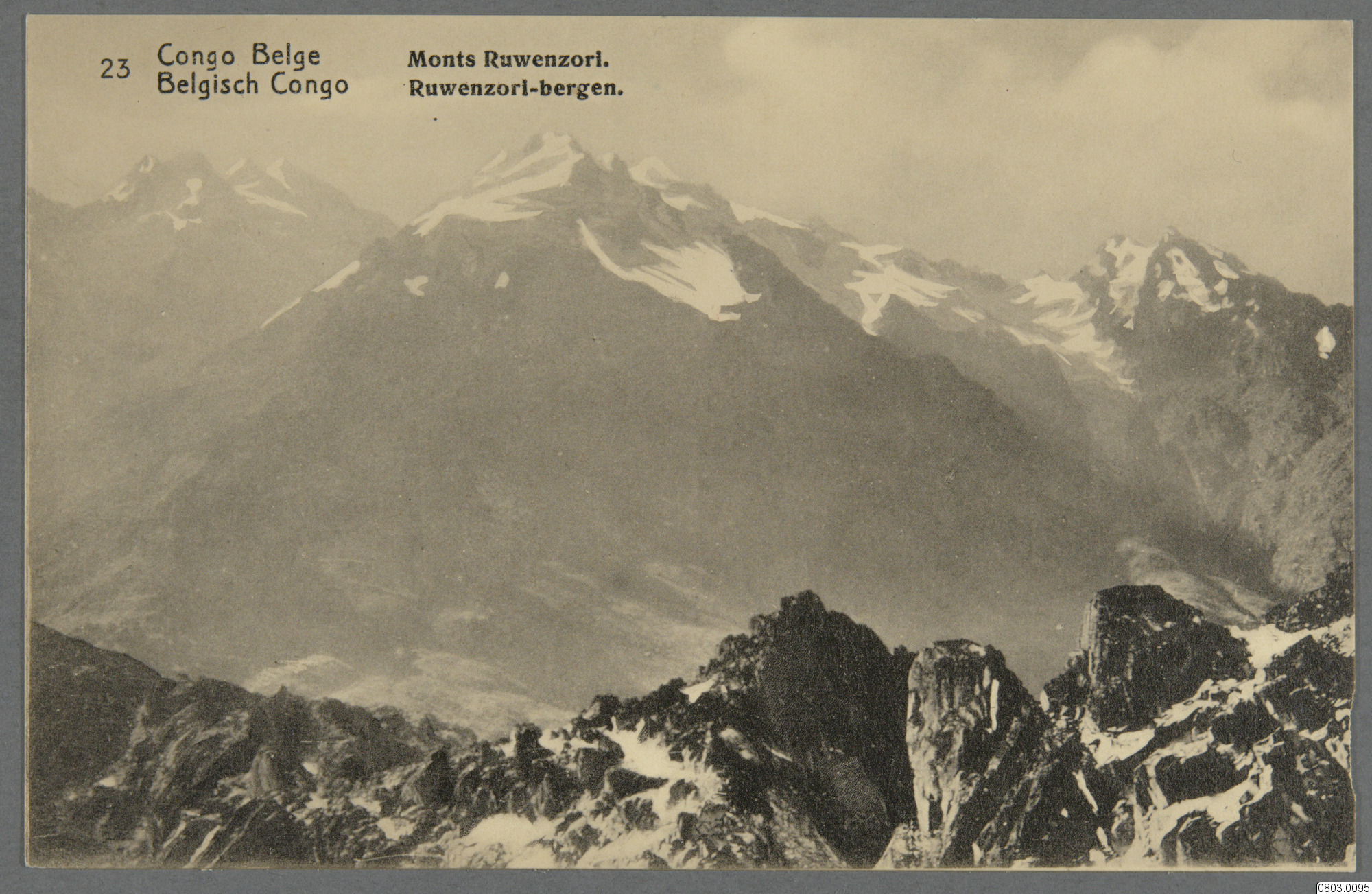 Vykort med motiv av snöbeklädda begrstoppar. Text på framsida: "Congo Belge, Belgisch Congo, Monts Ruwenzori, Ruwenzori-bergen." Text på baksida: "Congo Belge, Belgisch Congo, Carte Postale, Postkaart, Correspondance, Briefwisseling, Adresse, Adres."