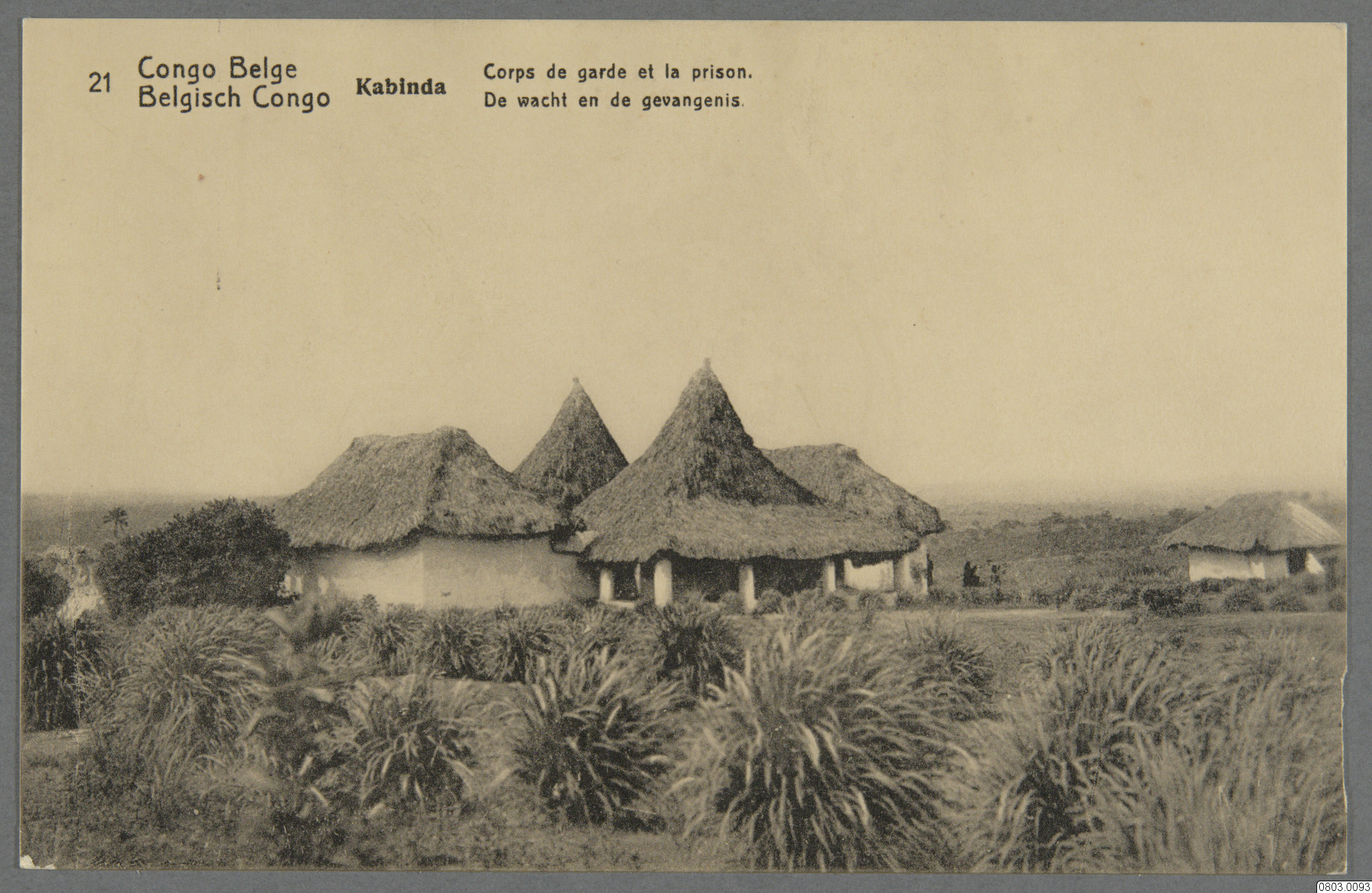 Vykort med motiv av vakthus och fängelse, buskage i förgrunden. Text på framsida: "Congo Belge, Belgisch Congo, Kabinda, Corps de garde et la prison, De wacht en de gevangenis." Text på baksida: ""Congo Belge, Belgisch Congo, Carte Postale, Postkaart, Correspondance, Briefwisseling, Adresse, Adres."