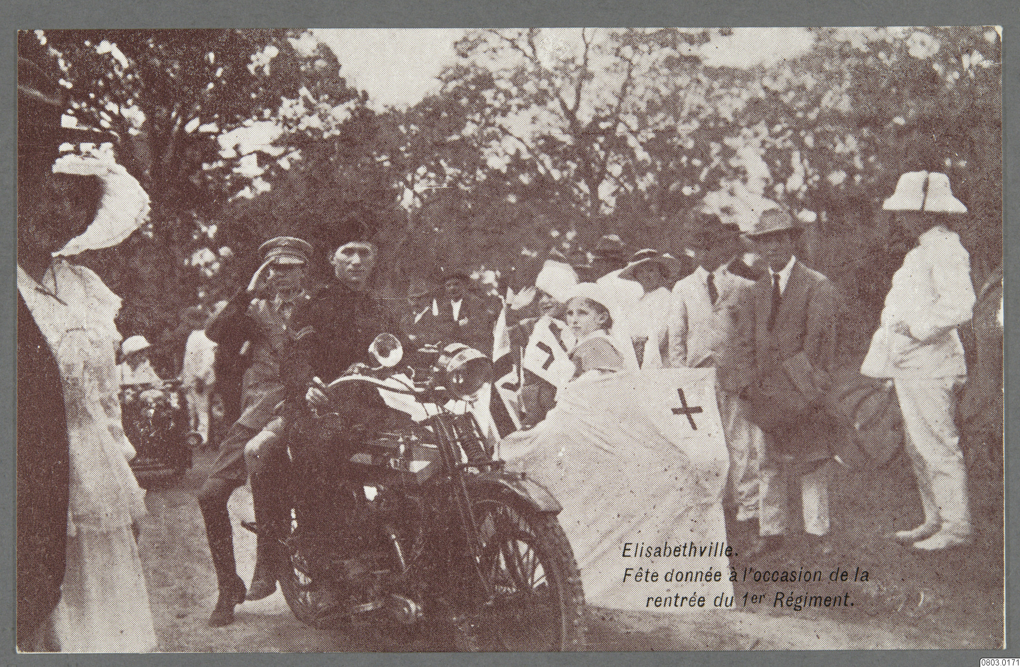 Vykort med motiv av fest i Lubumbashi som ges med anlending av 1:a Regementets återkomst. Folksamling i finkläder omger två män i uniform på en motorcykel, en gör honnör. Kvinna med huvudbonad och textil med kors ser på. Text på framsida: "Elisabethville, Féte donnée á l' occasion la rentrée du 1er Régimente." Text på baksida: "CARTE POSTALE."