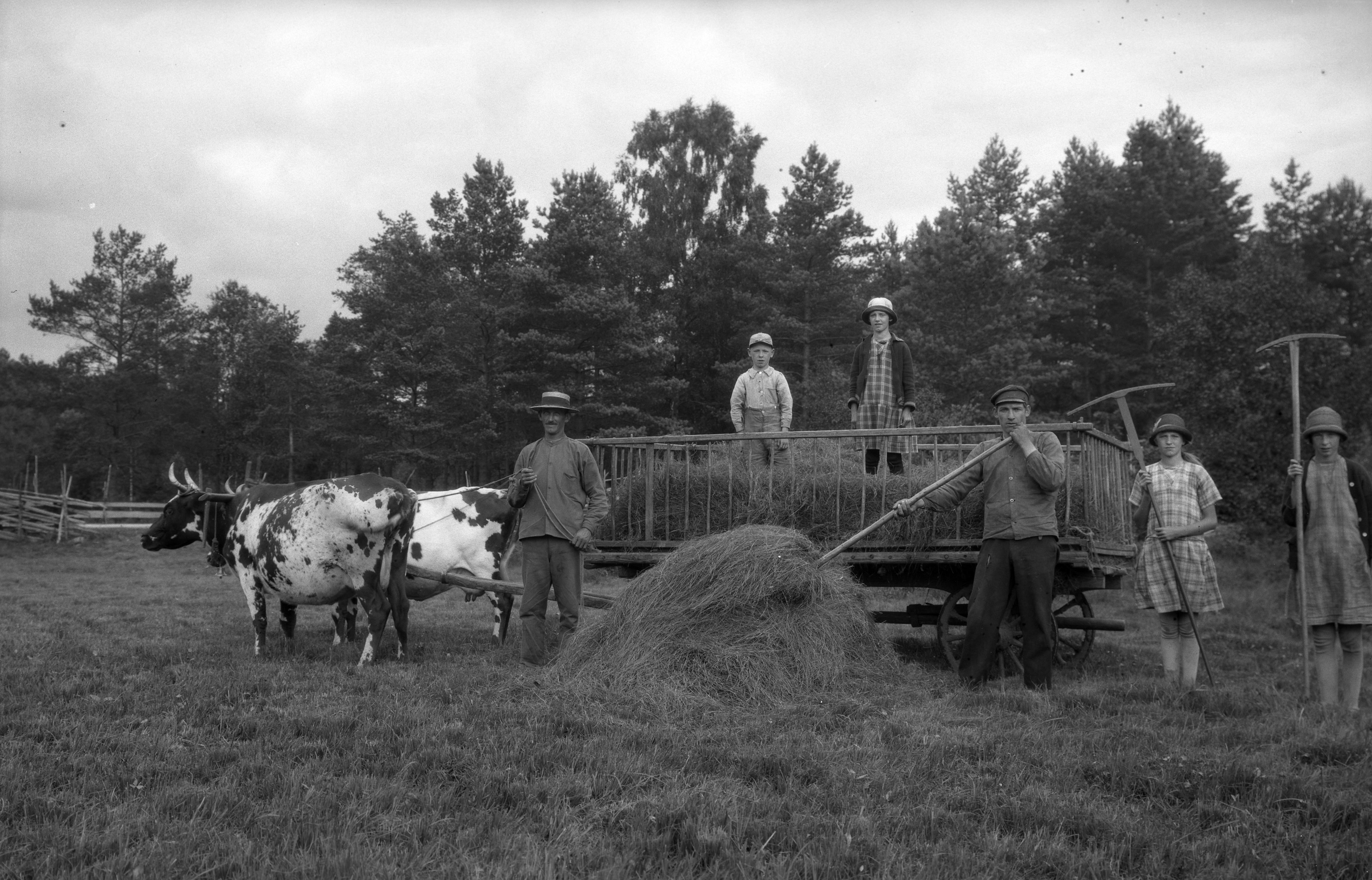 Bärgning av hö på hölass draget av kor.