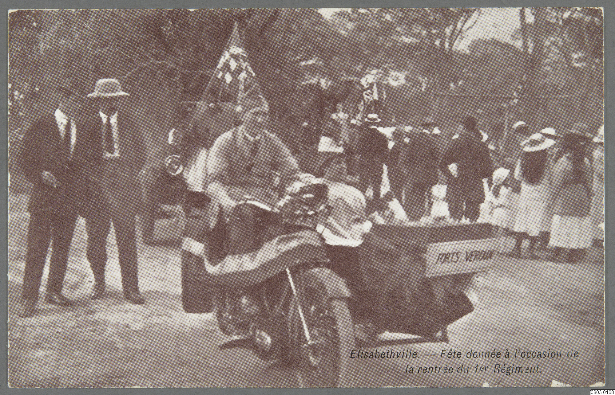 Vykort med motiv av fest i Lubumbashi som ges med anlending av 1:a Regementets återkomst. Folksamling i finkläder, män på motorcykel med sidovagn. Text på framsida: "Elisabethville, Féte donnée á l' occasion la rentrée du 1er Régimente." Text på baksida: "CARTE POSTALE."