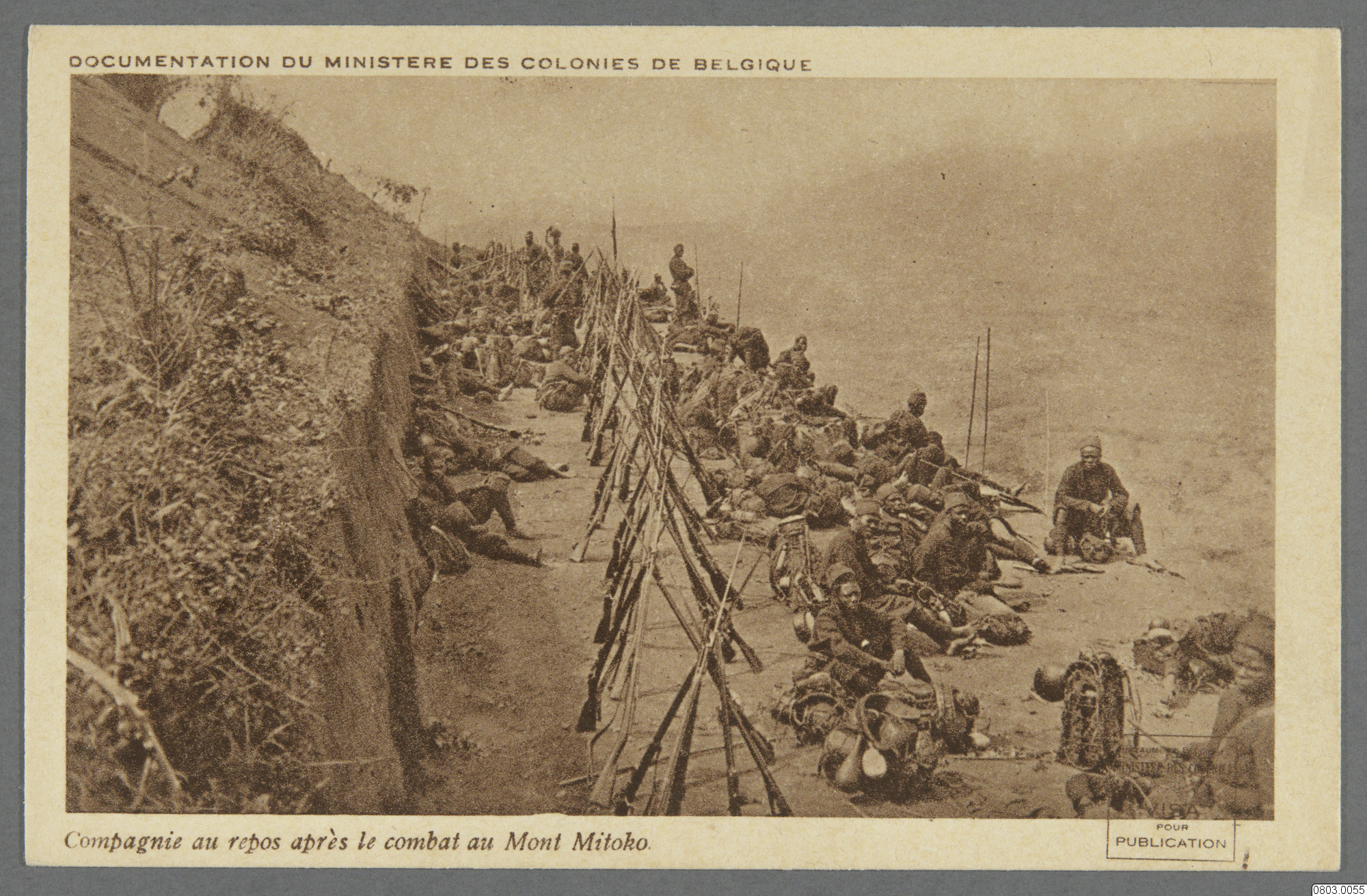 Vykort med porträtt av ett komapni som sitter och vilar. Text på framsida: "Documentation du Ministere des Colonies de Belgique. Compagnie au repos après le comabt au Mont Mitoko" Text på baksida: "Carte Postale, Publiée au bénéfice de l'œuvre; "Asiles des soldats invalides belges. Cabinet de Mr. le Ministre Vandervelde, Ste. Adresse, France (Seine Inférieure). Côte réservé à l'adresse."
