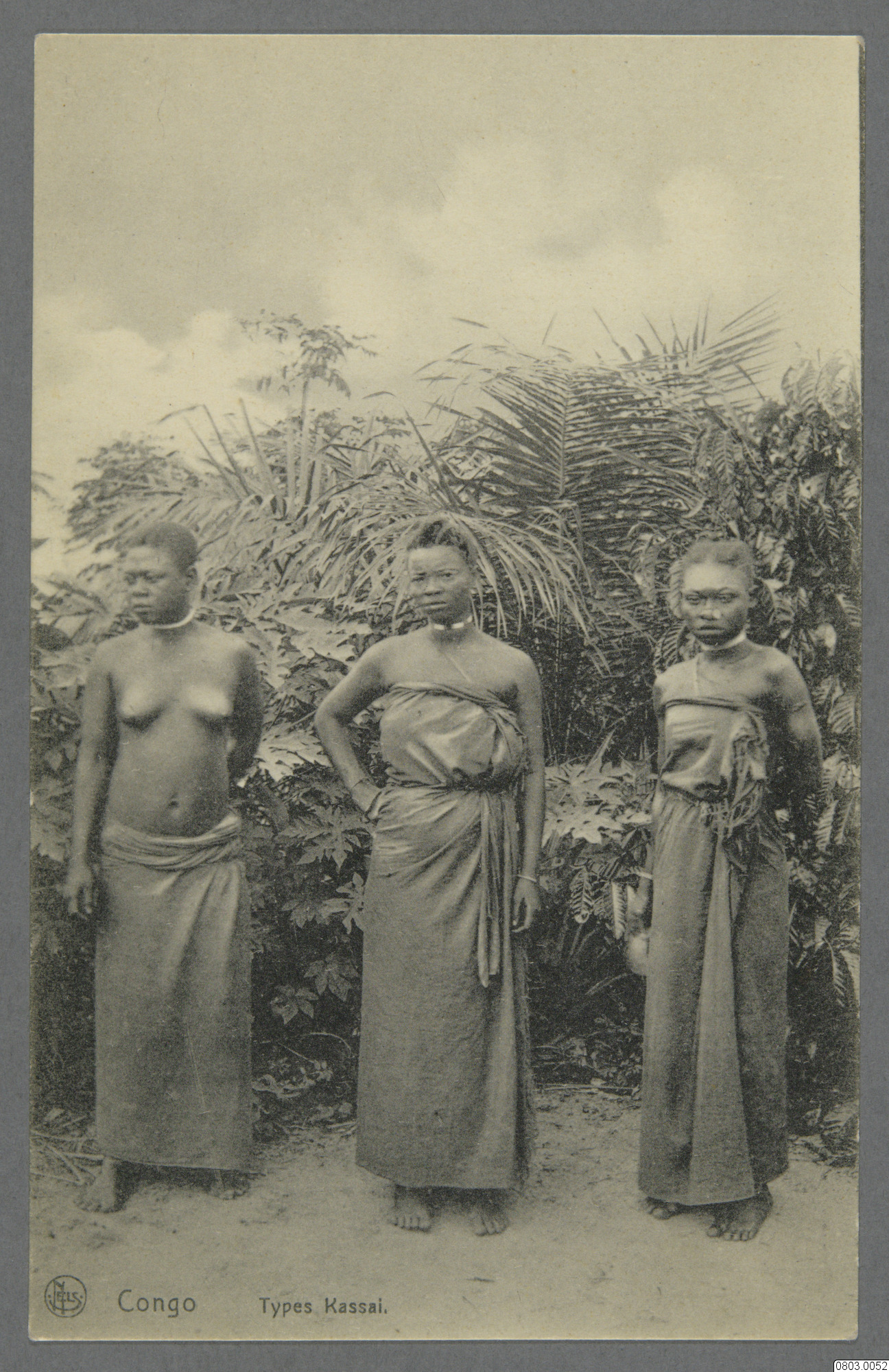 Vykort med porträtt av tre kvinnor. Text på framsida: "Congo. Types Kassai" Text på baksida: "Carte Postale, Correspondance, Adresse, Ed. Nels, Bruxelles. Serie 14 No. 8. "
