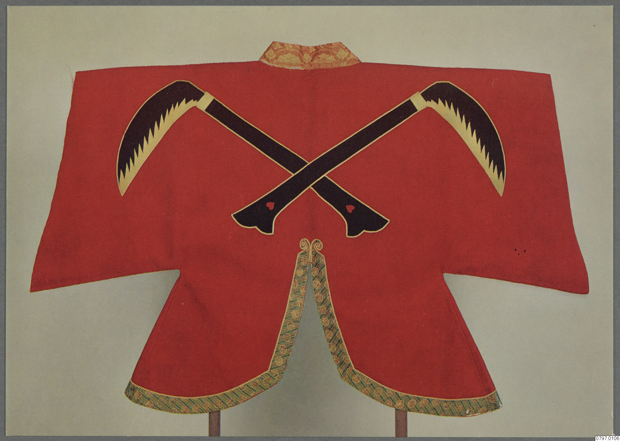 Vykort med motiv av rött utfläkt plagg med svarta korsade skäror på framsidan, gulmönstrad krage samt gulgrön mönstrad nederkant; Jimbaorikappa av rött ull som bars utanpå rustning. Momoyamaperioden, 1500-talet, Japan. Text på baksida: "Text på Japanska, Jimbaori (coat worn over armor.) Scarlet wool, with design of crossed sickles. Momoyama Period, 16th century, POST CARD, Text på Japanska, Printed and Published by BENRIDO, Tokyo - Kyoto, Edited by TOKYO NATIONAL MUSEUM."