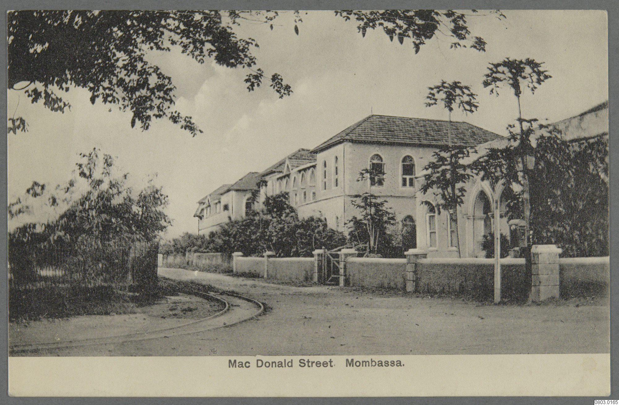 Vykort med motiv av Mac Donaldgatan i Mombasa. Bostäder innanför murar vid gata, räls utan syll samt träd. Text på framsida: "Mac Donald Street. Mombassa." Text på baksida: "Post Card, Made in Germany, Felix Coutinho, Photographer. Mombassa."
