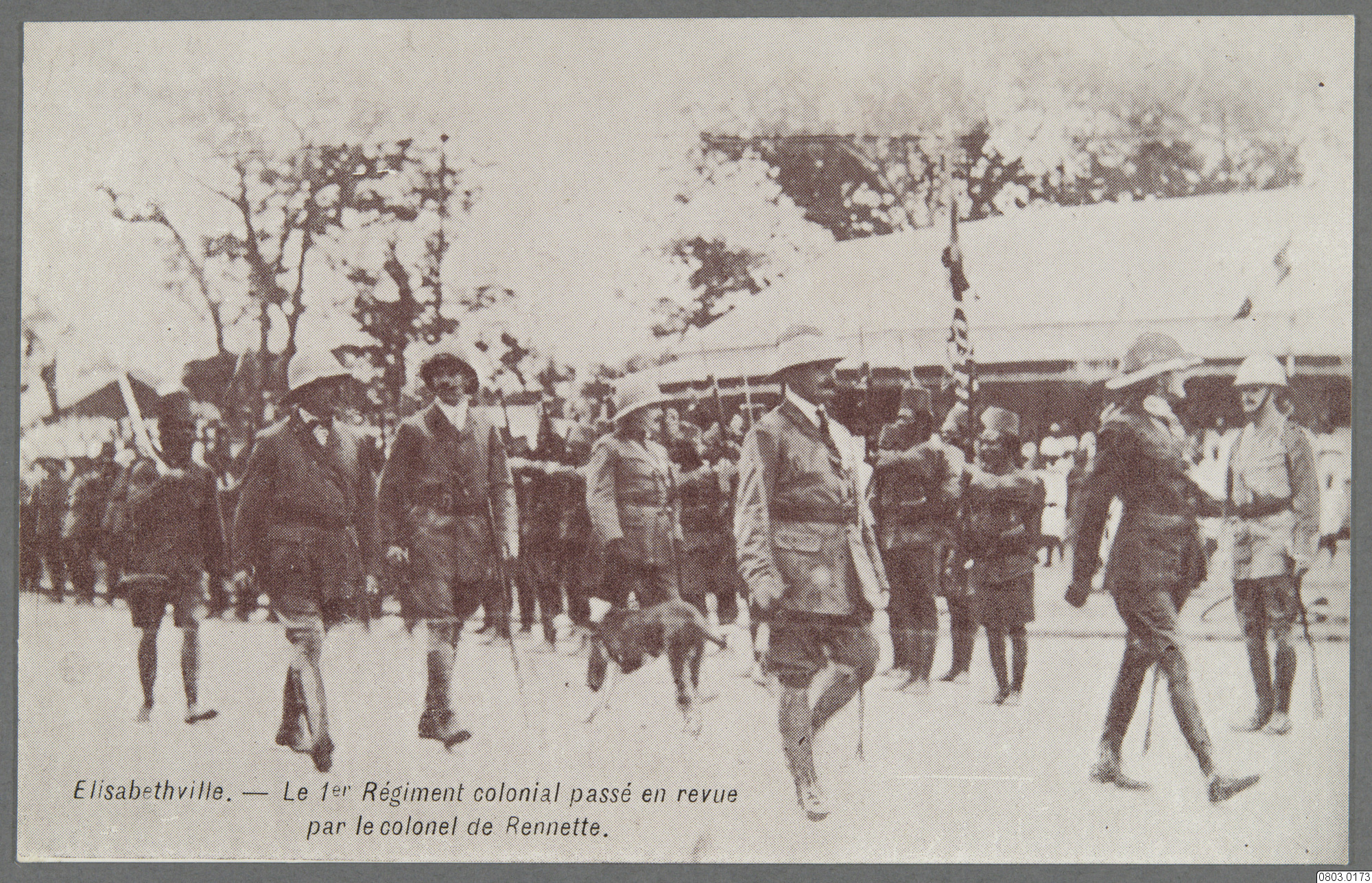 Vykort med motiv av 1:a Kolonialregementet som inspekteras av överste Renette, beväpnade trupper i uniformer. Text på framsida: "Elisabethville - Le 1er Régiment colonial passé en revue par le colonel de Renette." Text på baksida: "CARTE POSTALE"