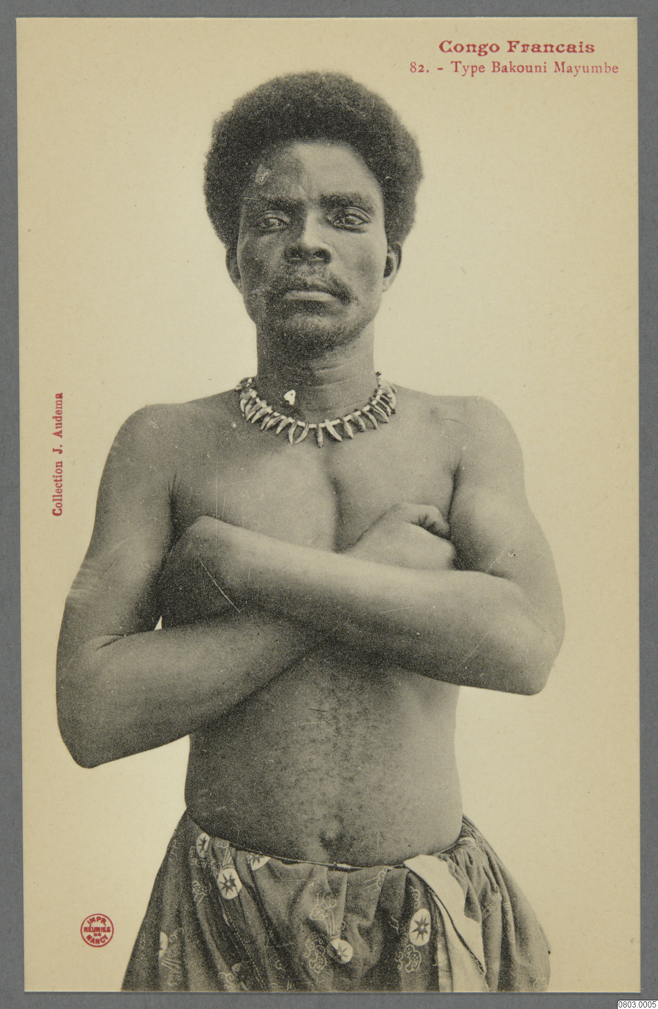 Vykort med porträtt av en man. Text på framsida: "Congo Francais. 82. Type Bakouni Mayumbe. Collection J. Audema." Text på baksida: "Carte Postale. Correspondance. Adresse"