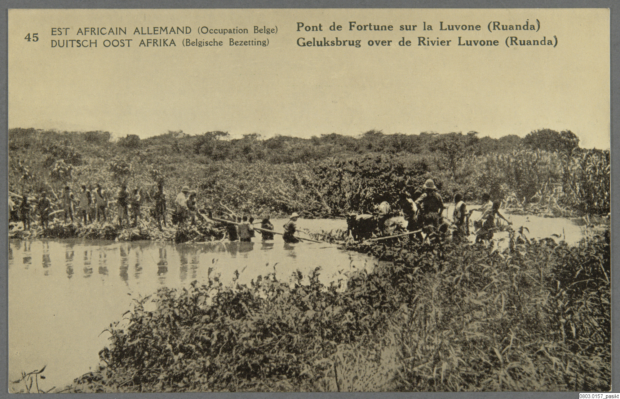 Vykort med motiv av människor byggandes (?) en bro över Luvonefloden I Rwanda. Text på framsida: "Est Africain Allemand (Occupation Belge), Dutsch Oost Afrika (Belgische Bezetting), Pont de Fortune sur la Luvone (Ruanda), Geluksbrug over de Rivier Luvone (Ruanda)." Text på baksida: "Congo Belge, Belgisch Congo, Carte Postale, Postkaart, Correspondance, Briefwisseling, Adresse, Adres. Waterlow & Sons Limited, Londres, Angleterre."
