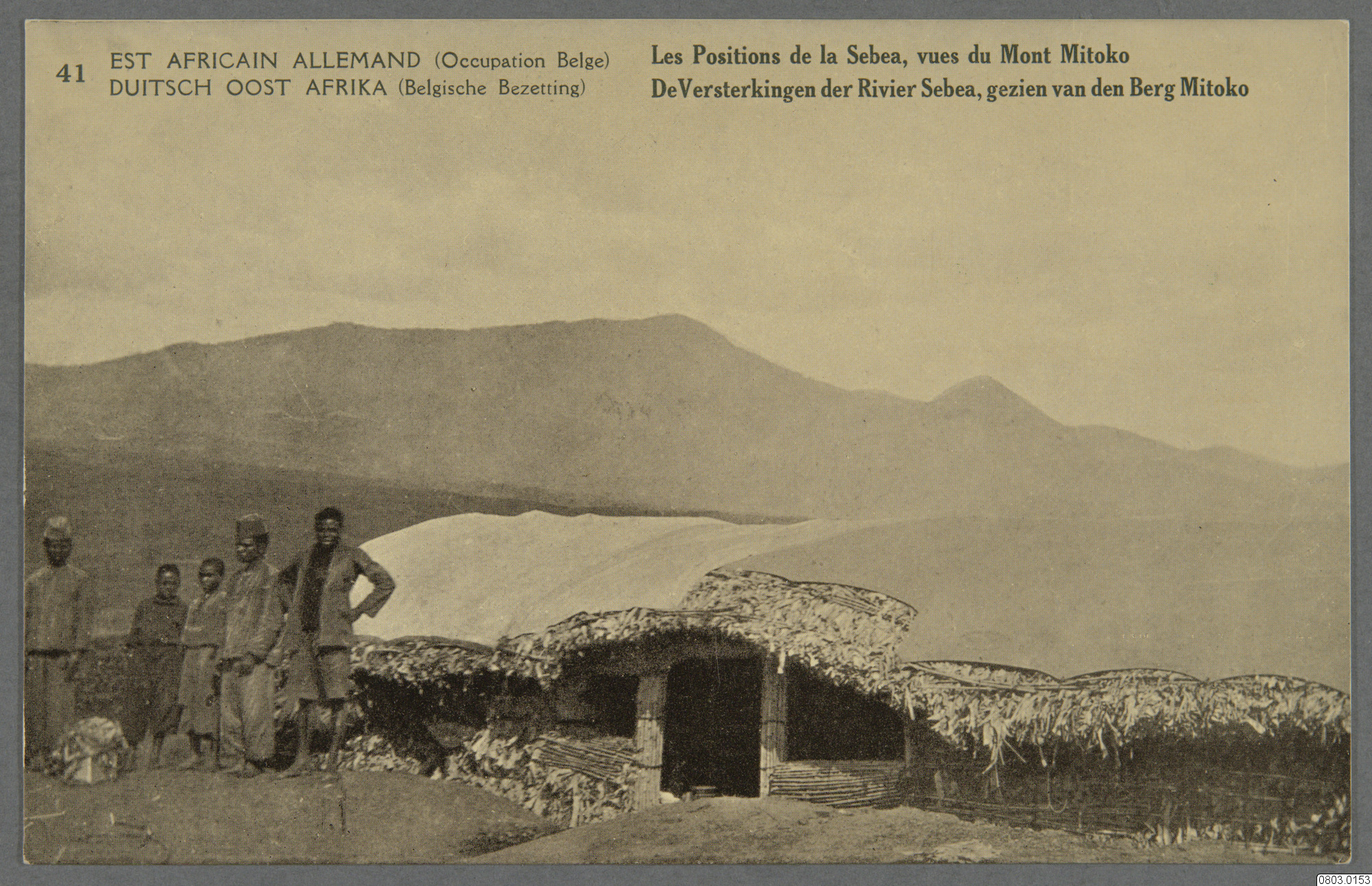 Vykort med motiv av Sebeabefästningar sett från Mitokoberget, urinvånare vid byggnad. Text på framsida: "Est Africain Allemand (Occupation Belge), Dutsch Oost Afrika (Belgische Bezetting), Les Positions de la Sebea, vues du Mont Mitoko, De Versterkingen der Rivier Sebea, gezien van den Berg Mitoko." Text på baksida: "Congo Belge, Belgisch Congo, Carte Postale, Postkaart, Correspondance, Briefwisseling, Adresse, Adres. Waterlow & Sons Limited, Londres, Angleterre."