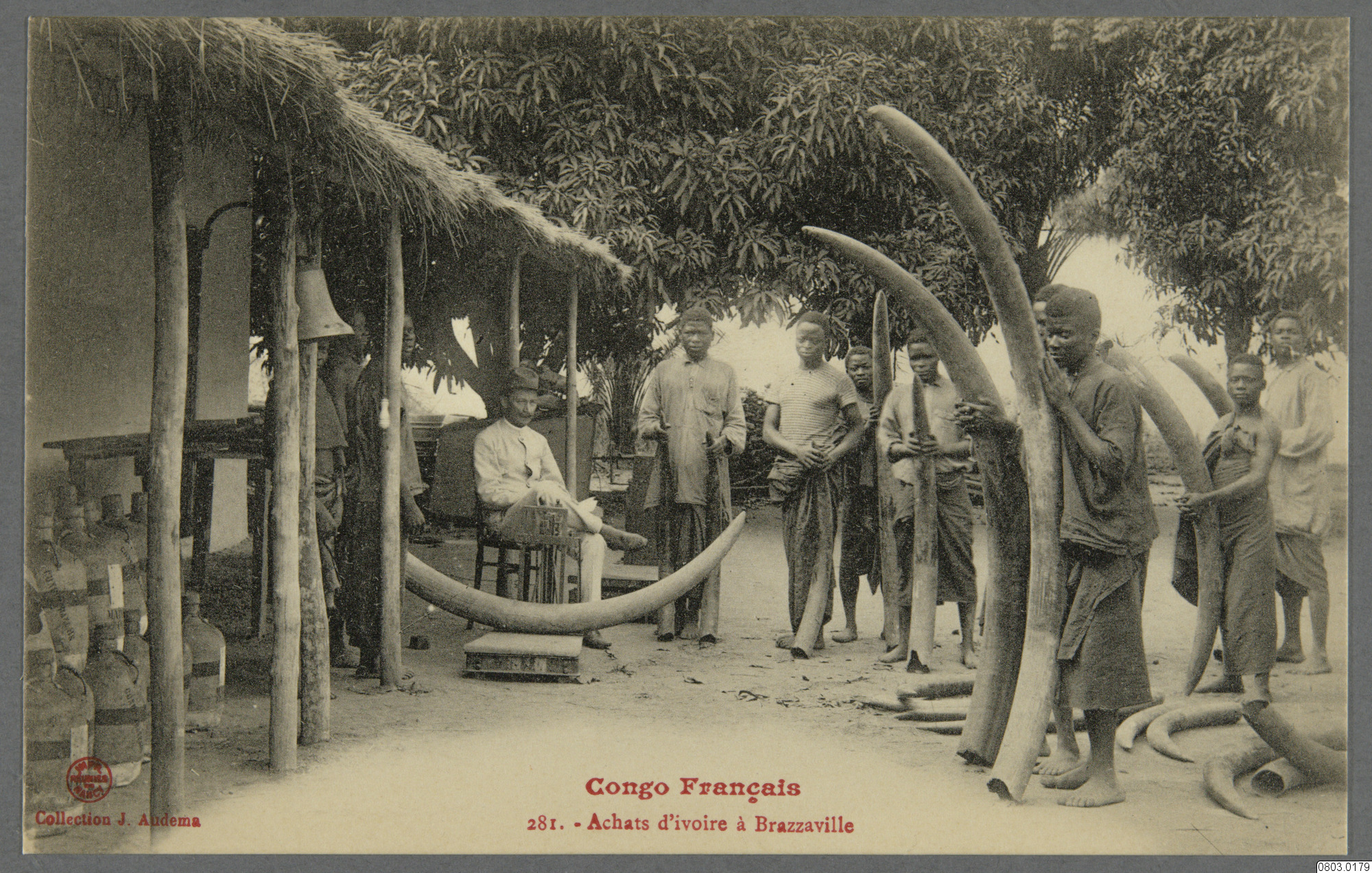 Vykort med motiv av elfenbensinköp i Brazzaville, urinvånare ståendes med elfenben framför byggnad, sittande man i stol. Text på framsida: "Collection J. Audema, Congo Francais, 281, - Achats d'ivorie á Brazzaville." Text på baksida: "CARTE POSTALE, CORRESPONDANCE, ADRESSE."