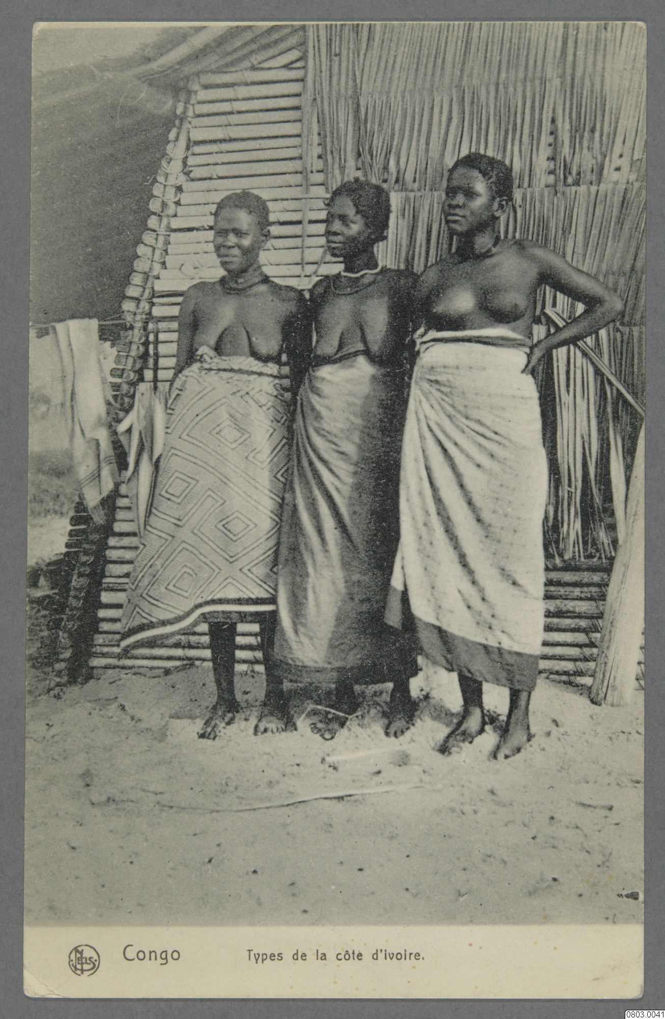 Vykort med motiv av tre kvinnor stående framför ett hus. Text på framsida: "Congo. Types de la côte d'lvoire" Text på baksida: "Carte Postale, Correspondance, Adresse, Ed. Nels, Bruxelles, serie 14, No. 18."