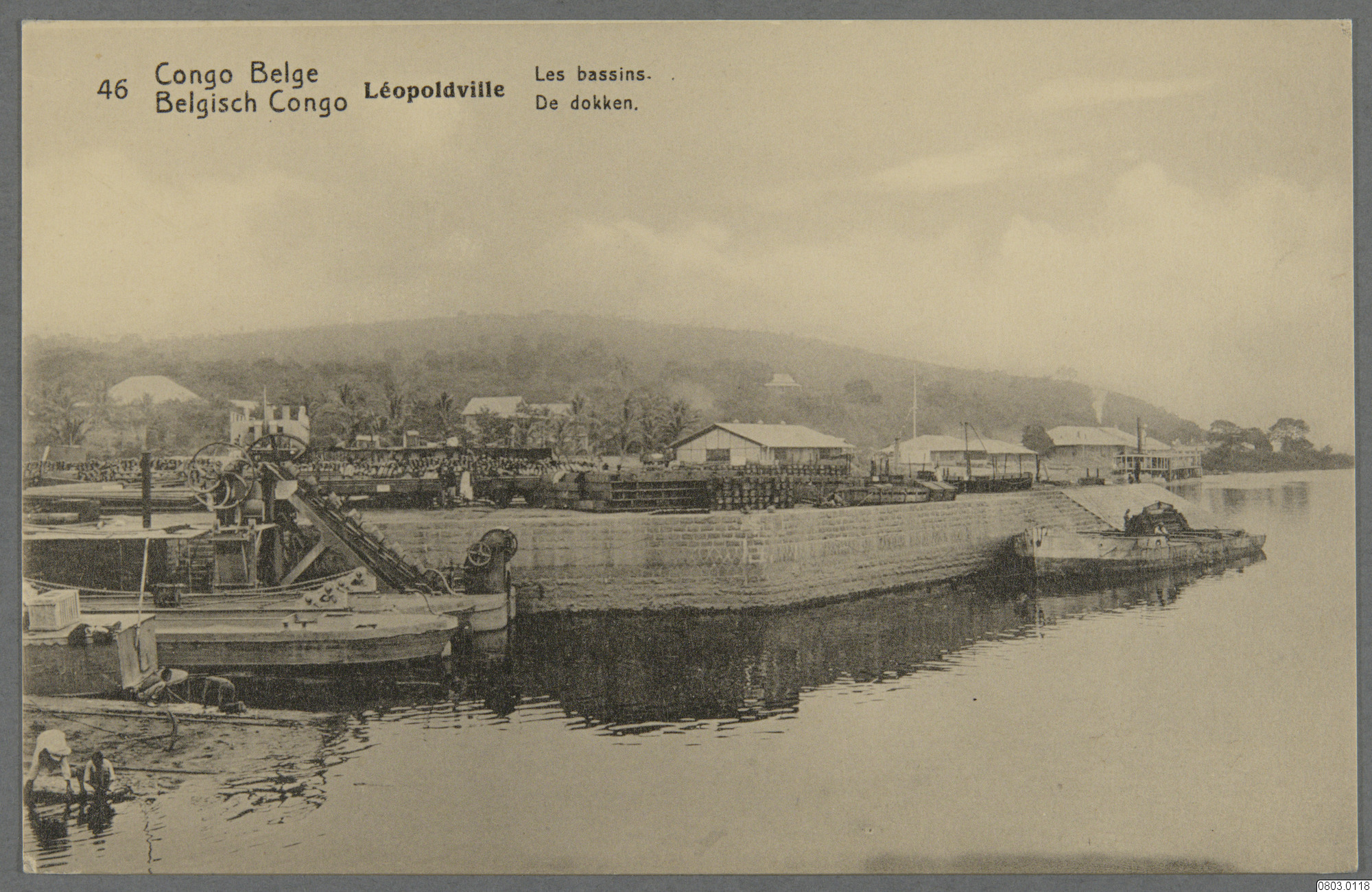 Vykort med motiv av bassäng och docka i Lusambo. Text på framsida: "Congo Belge, Belgisch Congo, Léopoldville, Les bassins, De dokken." Text på baksida: "Congo Belge, Belgisch Congo, Carte Postale, Postkaart, Correspondance, Briefwisseling, Adresse, Adres."