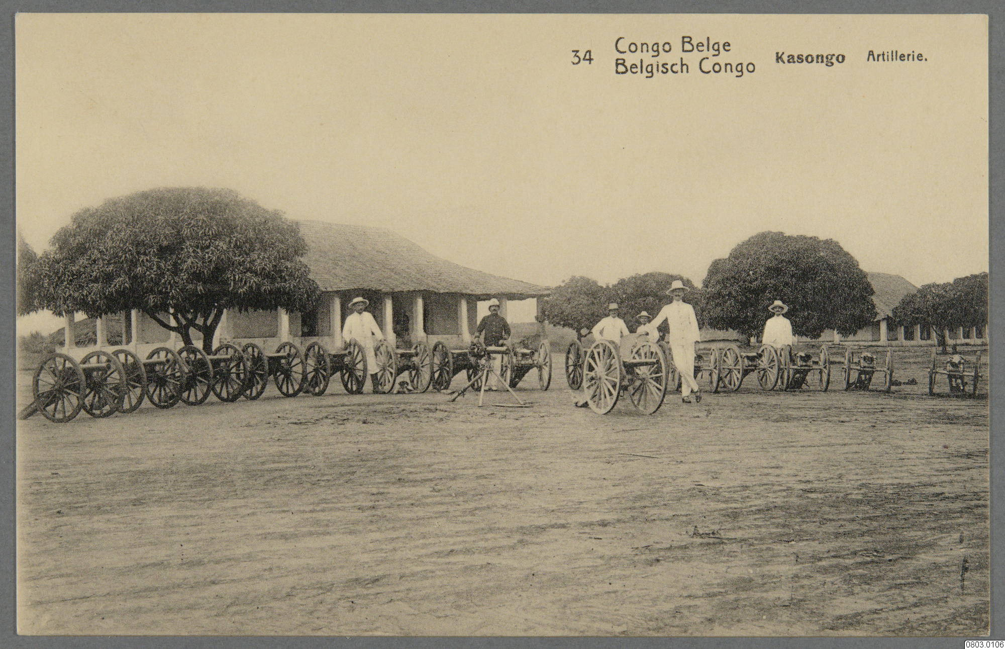 Vykort med motiv av artelleri och män. Text på framsida: "Congo Belge, Belgisch Congo, Kasongo, Artillerie." Text på baksida: " Congo Belge, Belgisch Congo, Carte Postale, Postkaart, Correspondance, Briefwisseling, Adresse, Adres."