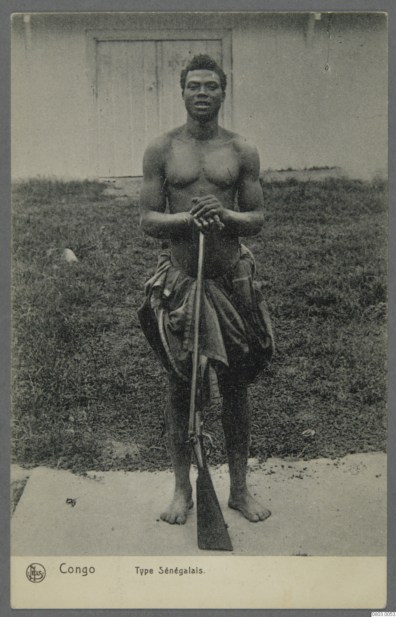 Vykort med porträtt av en man, stående med ett gevär. Text på framsida: "Congo. Type Sénégalais" Text på baksida: "Carte Postale, Correspondance, Adresse, Ed. Nels, Bruxelles. Serie 14 No. 115. "