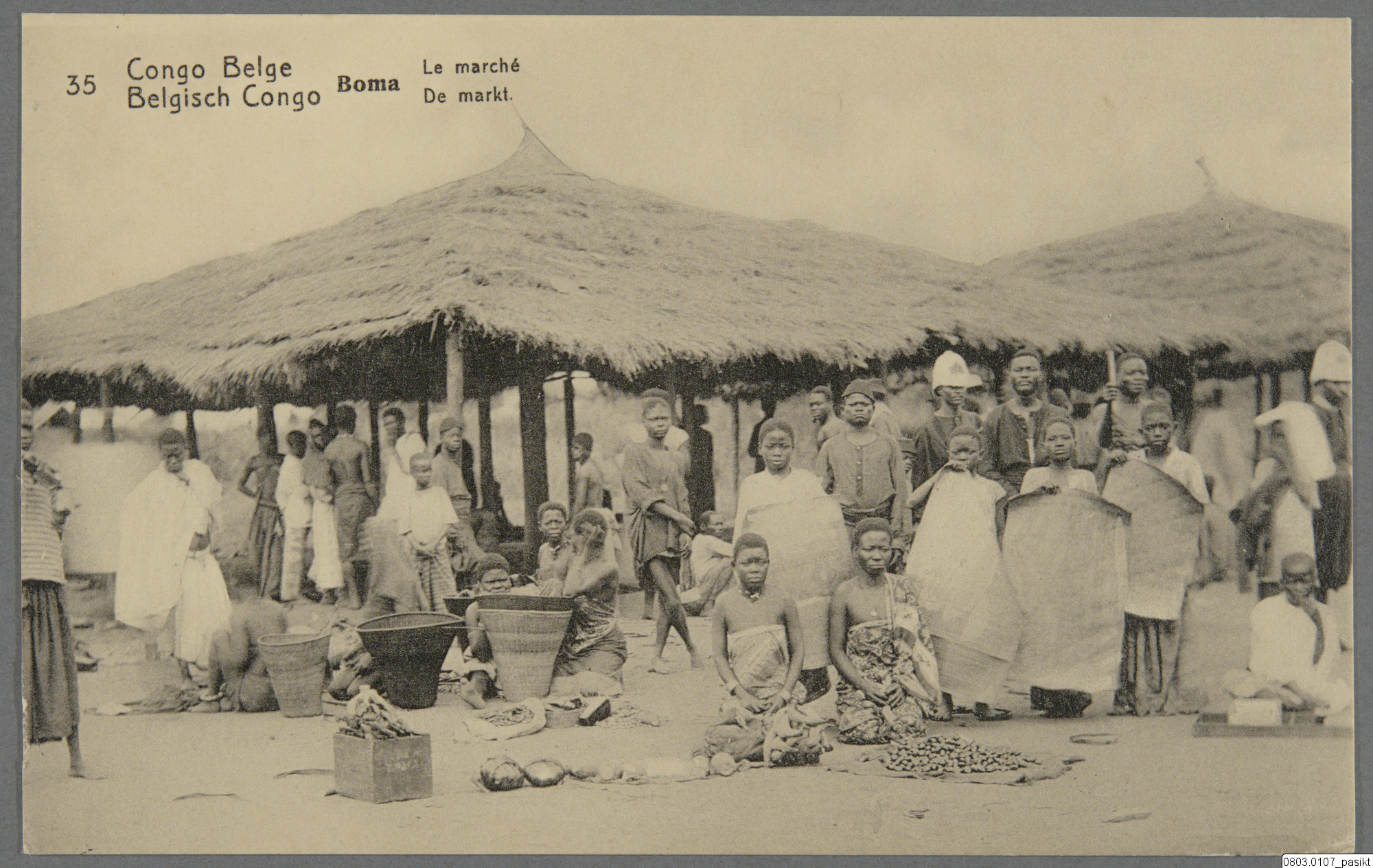 Vykort med motiv av urinvånare med varor på marknad i Boma. Text på framsida: "Congo Belge, Belgisch Congo, Boma, Le marché, De markt." Text på baksida: "Congo Belge, Belgisch Congo, Carte Postale, Postkaart, Correspondance, Briefwisseling, Adresse, Adres."