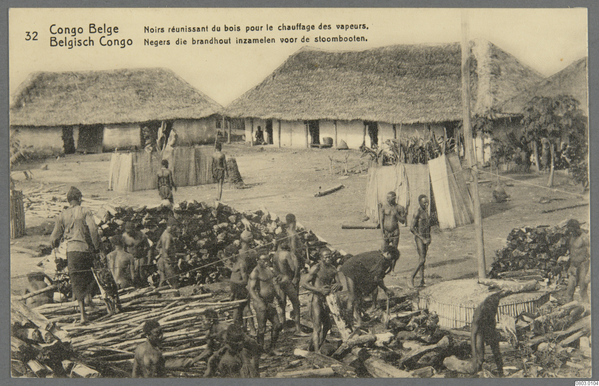 Vykort med motiv av urinvånare som samlar ved till ångbåt. Text på framsida: "Congo Belge, Belgisch Congo, Noirs réunissant de bois pour le chauffage des vapeurs, Negers die brandhout inzamelen voor de stoomboot." Text på baksida: " Congo Belge, Belgisch Congo, Carte Postale, Postkaart, Correspondance, Briefwisseling, Adresse, Adres."