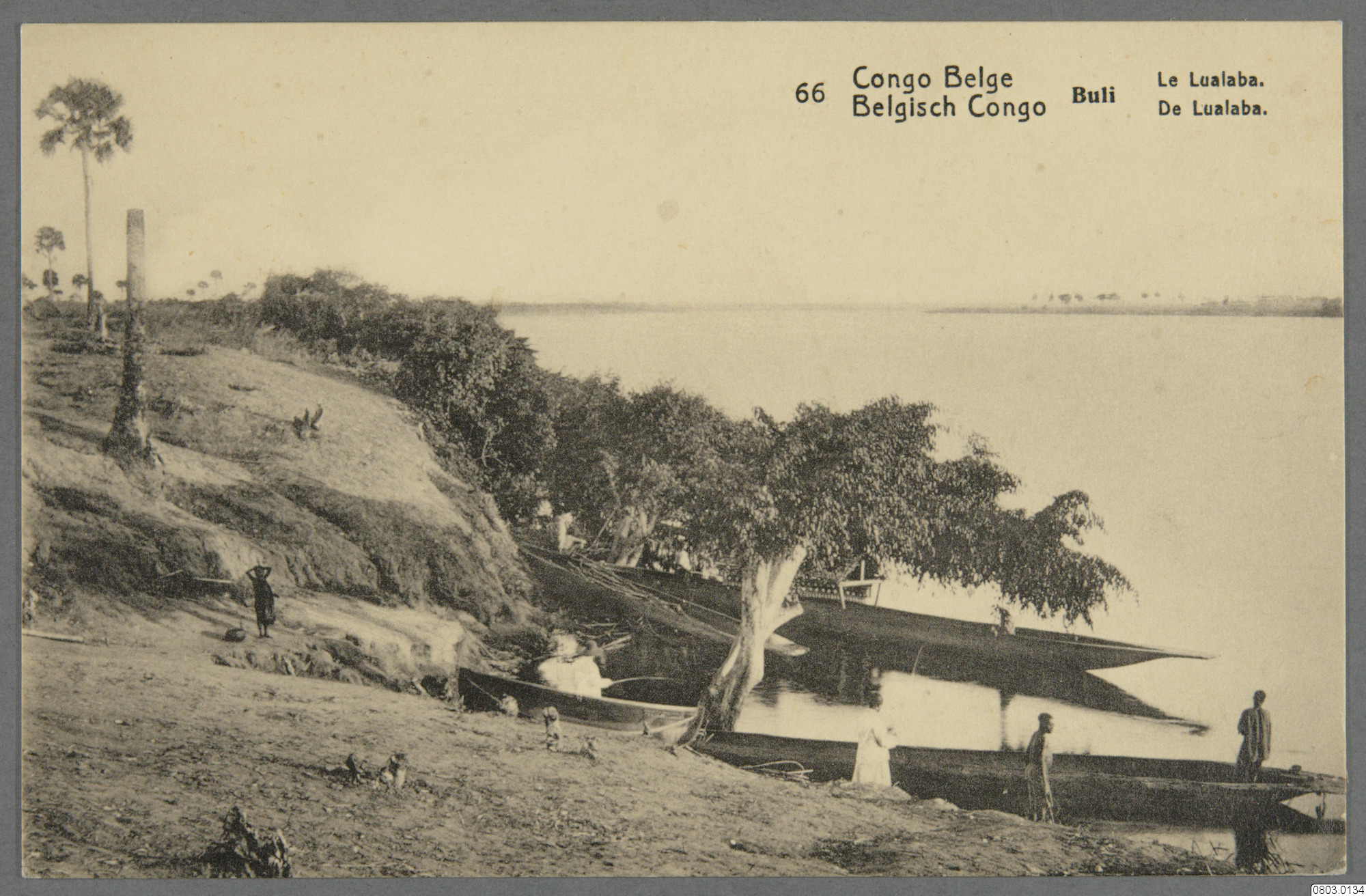 Vykort med motiv av båtar och människor vid strandkanten i Lualaba, träd hänger över vattnet. Text på framsida: "Congo Belge, Belgisch Congo, Buli, Le Lualaba, De Lualaba." Text på baksida: "Congo Belge, Belgisch Congo, Carte Postale, Postkaart, Correspondance, Briefwisseling, Adresse, Adres."