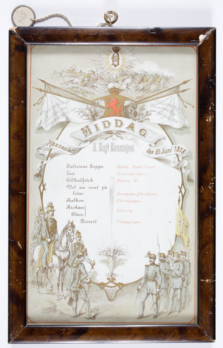 Inramad, rikt utsmyckad matsedel (fanor, landskapsvapen m.m.) vid "Middag för H.M. Konungen, Ränneslätt (Eksjö) den 25 juni 1878".