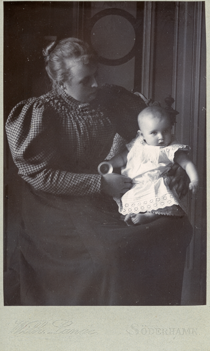 Porträtt av Sally Maria, troligen Rettig i knät på en kvinna, född den 12 okt. 1894 ?? 8 månader gammal (enligt text baksida kort).