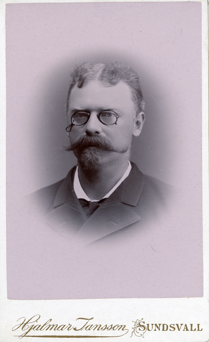 Porträtt av okänd man med glasögon och knävelborr-mustasch.