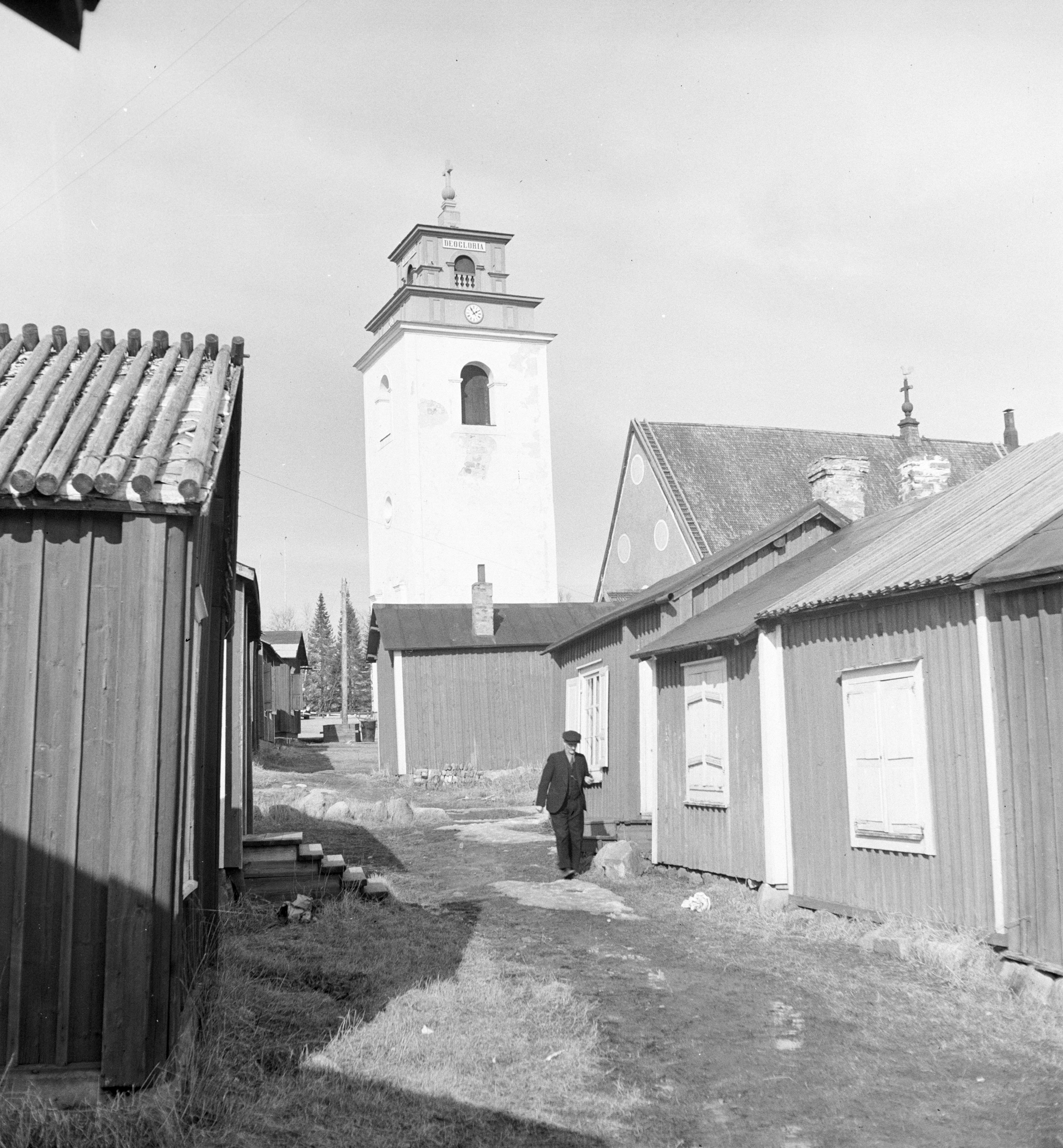 Kyrkstugor med Nederluleå kyrka i bakgrunden. Bilden tagen på 1940-talet.