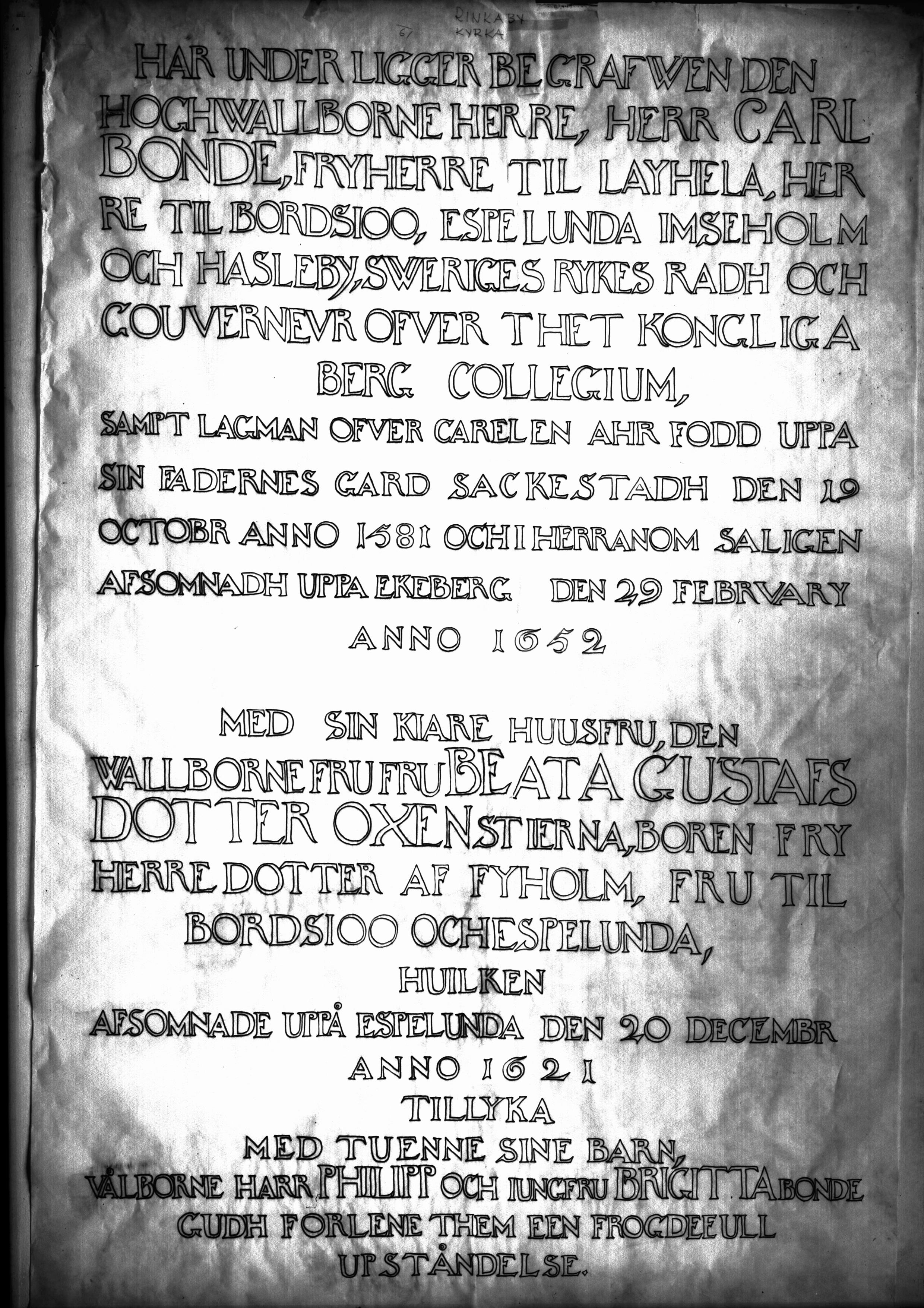 Avskrift av täckhällen på Bonde-Oxenstiernas gravtumba.