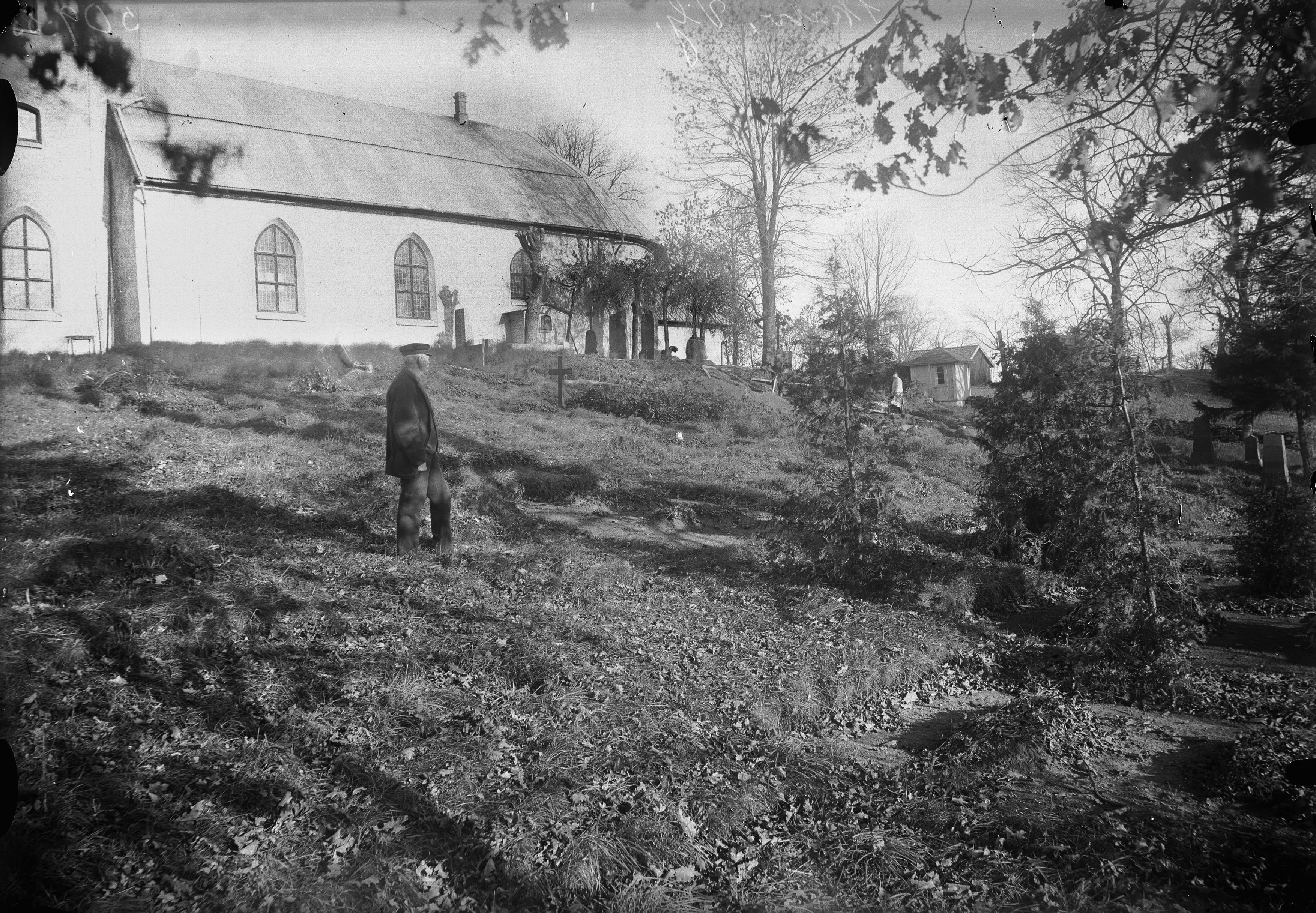 Kyrkan från sydväst. Före iordningställandet av kyrkogården.