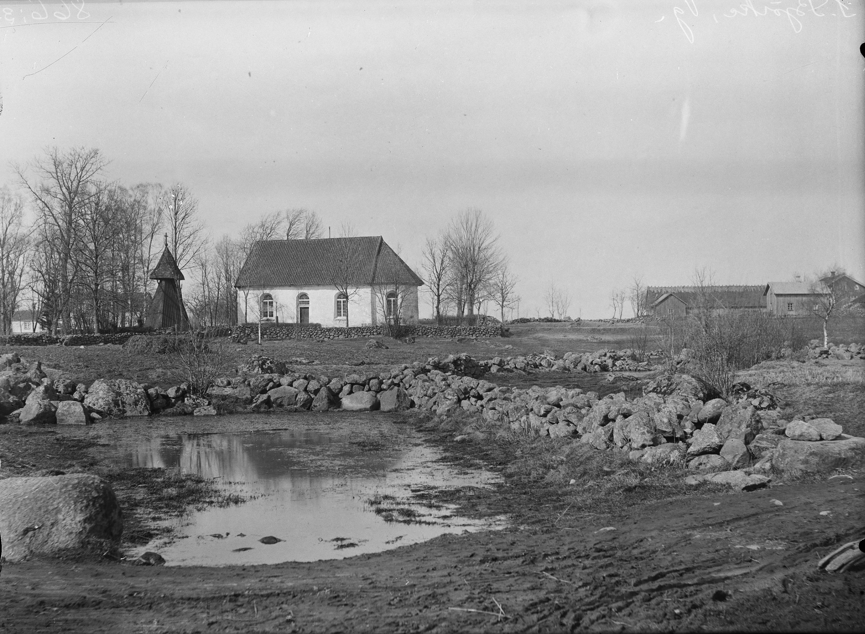 Kyrkan och klockstapeln från söder.