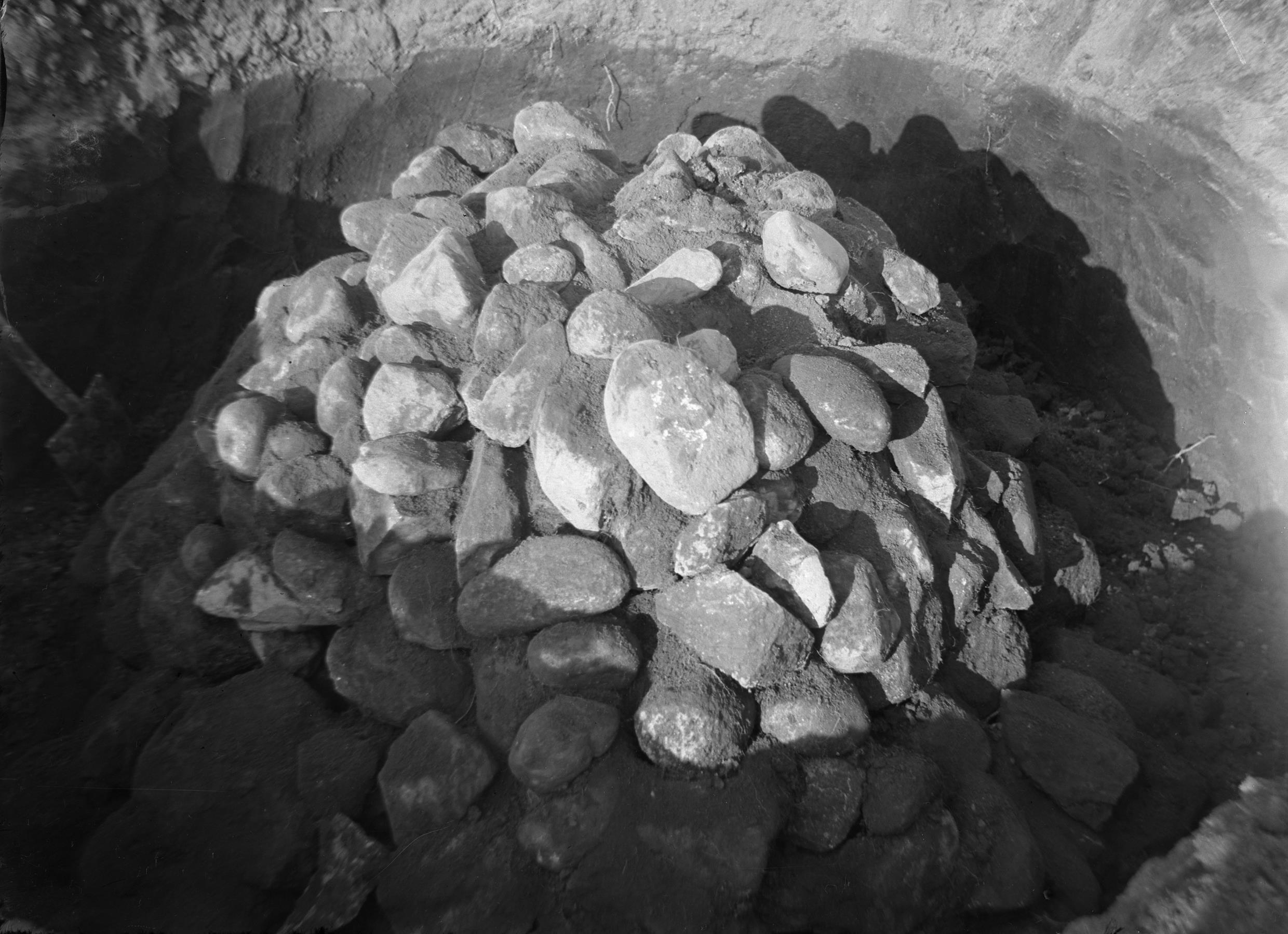 Foto taget vid gravundersökning juni 1913. Närbild på grav 13, stenpackning.