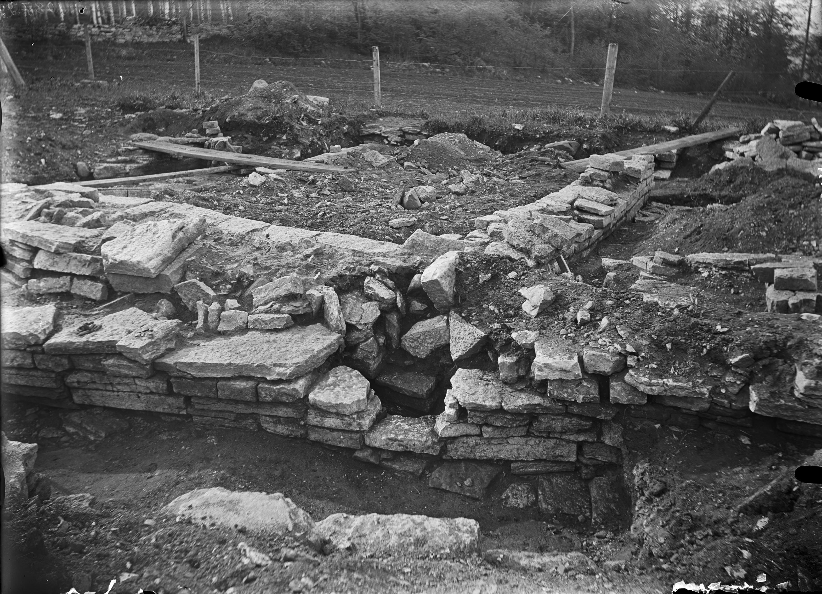 Byggnadens nordvästra murhörn blottat inne bakom stora vattenkanalens södra mur. Från nordväst.