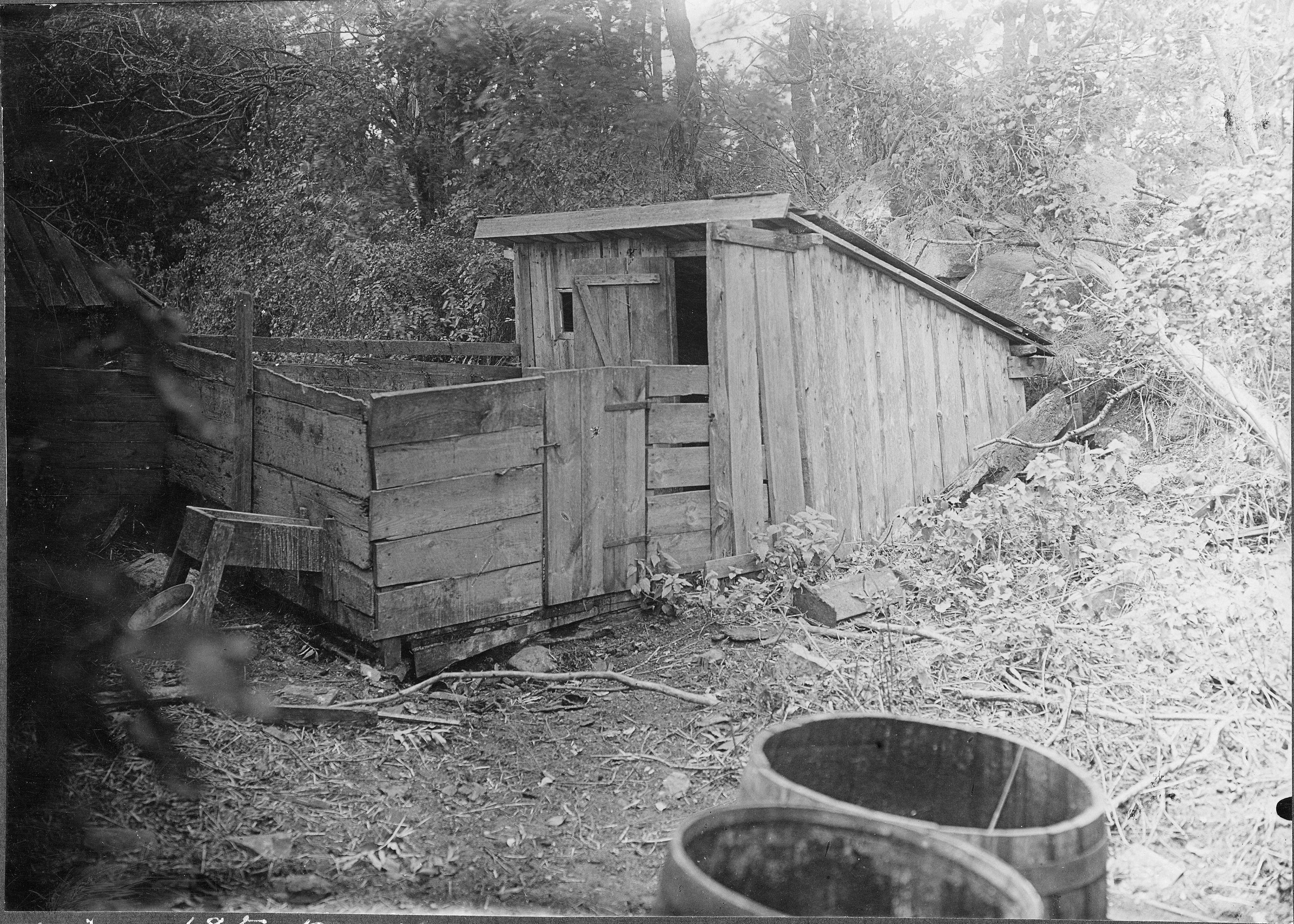 Parti mellan ruinen och källaren med svinhus och avträde.