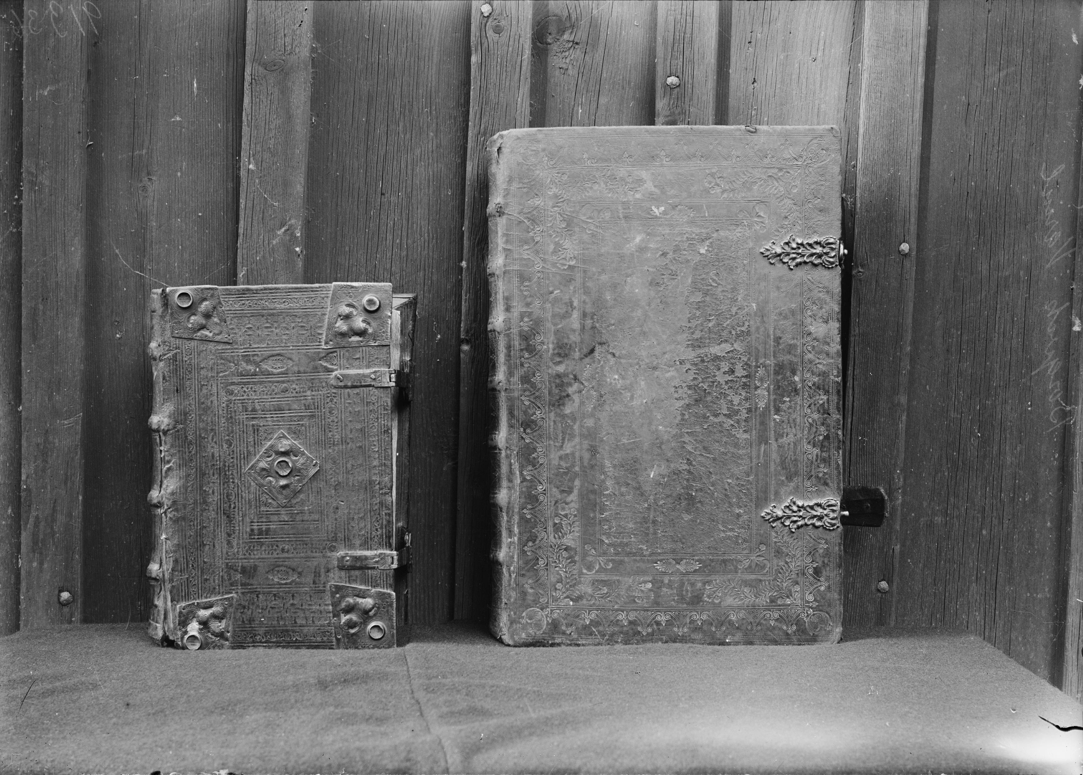 Biblar, t.v. Gustav Vasa-bibel från 1541, svart skinnband från 1620, t.h. Karl XII:s kyrkbibel från 1703, brunt skinnband från 1700-talets början.