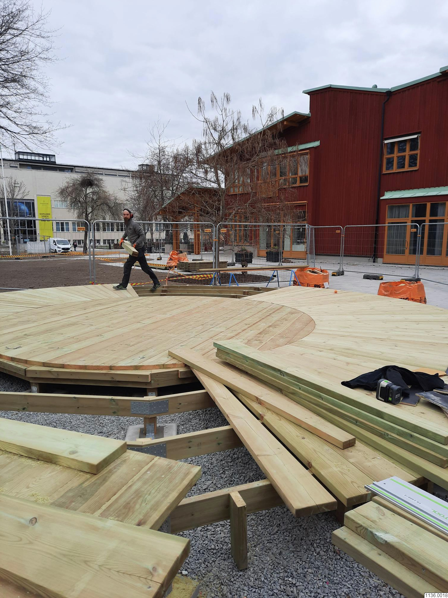 Scenbygge. Byggarbete pågår utanför Etnografiska museet inför anläggandet bland annat av en parkscen.