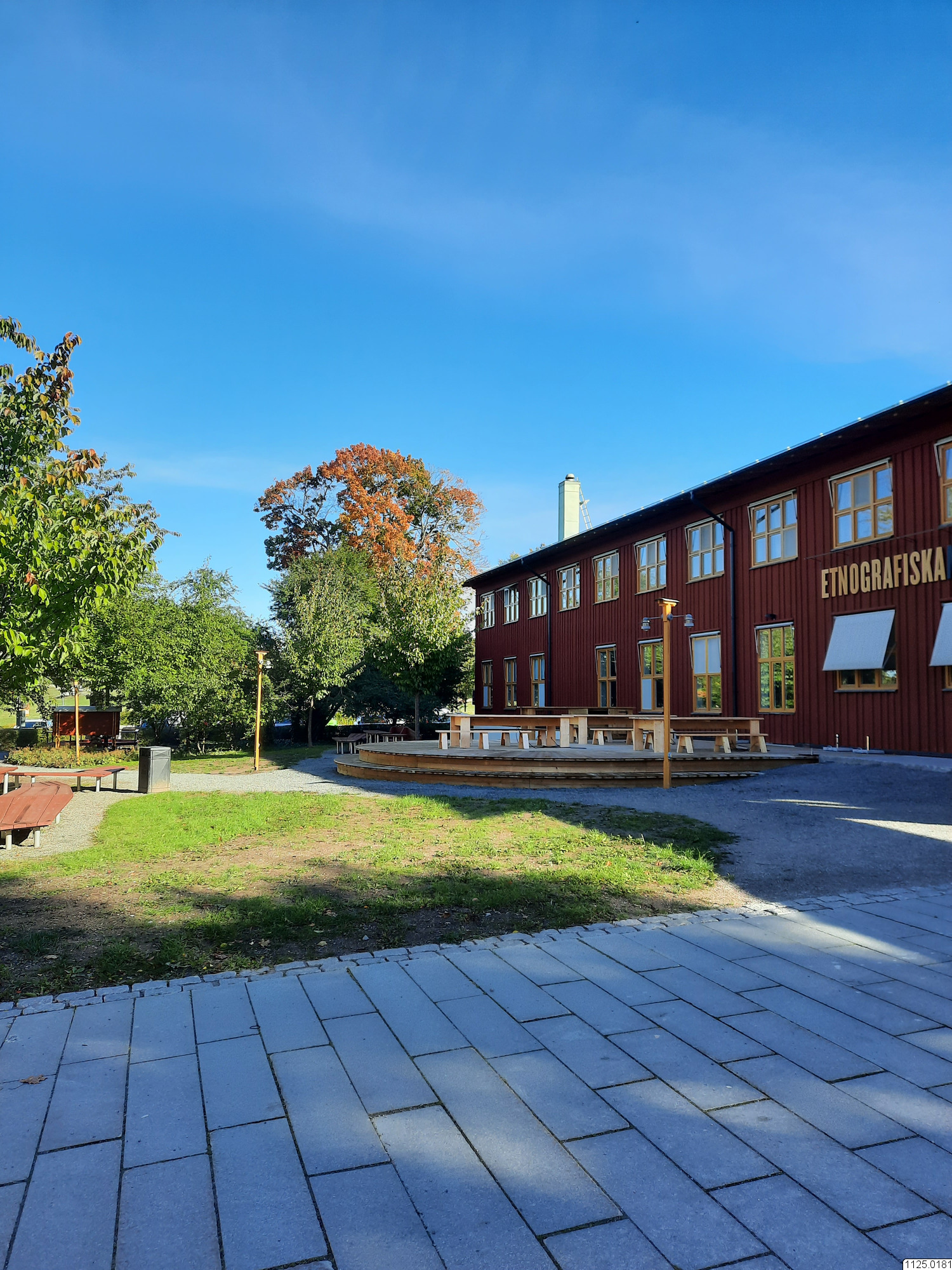 Utomhusverkstad klar. Byggarbete pågår utanför Etnografiska museet inför anläggandet bland annat av en parkscen.