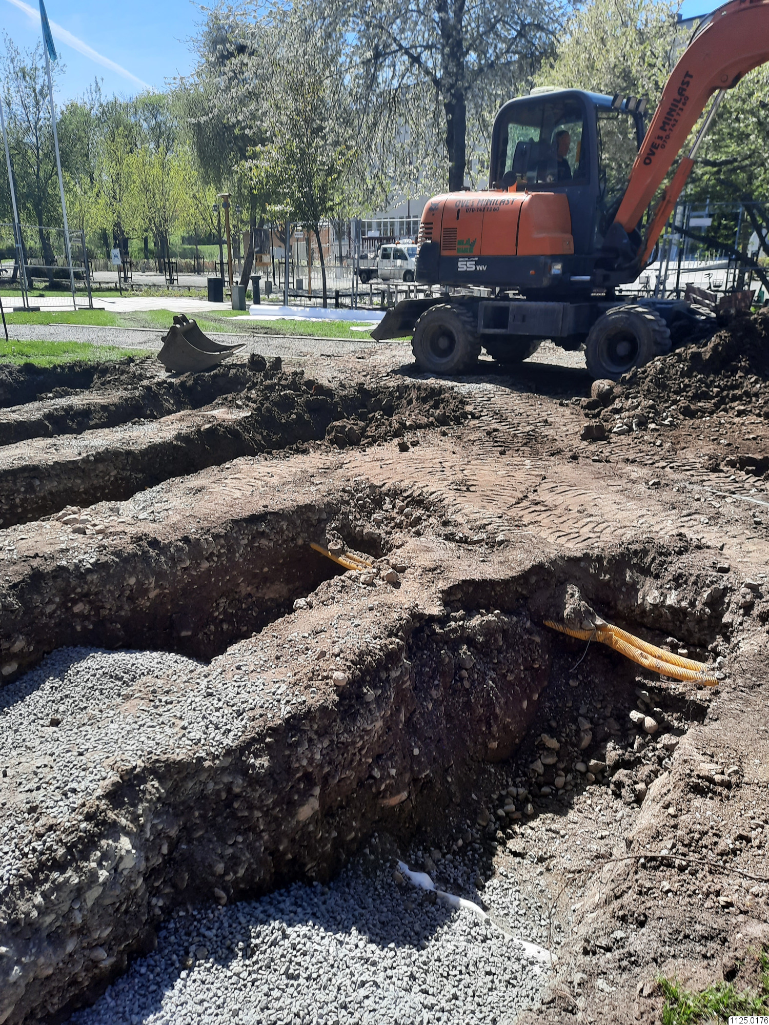 Grunden för utomhusverkstaden. Byggarbete pågår utanför Etnografiska museet inför anläggandet bland annat av en parkscen.