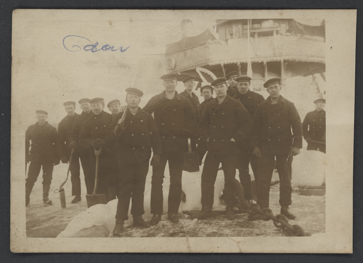 Bilden visar en grupp sjömän på pansarbåten Thule. Dem är beväpnad med skyfflarför att befria däcket från is.