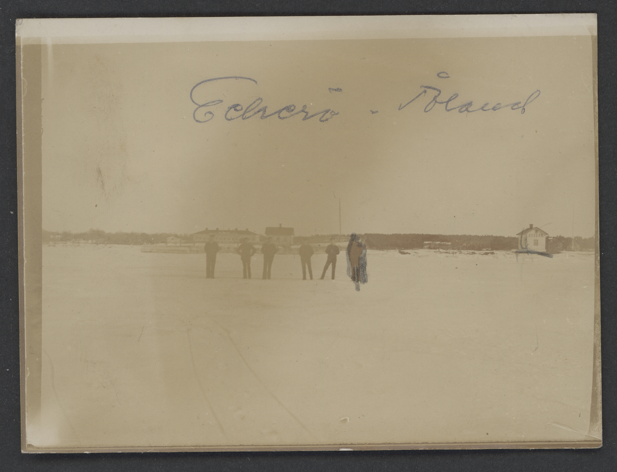Fem män står på isen i hamnen av Eckerö på Åland. I bakgrunden syns post- och tullhuset.