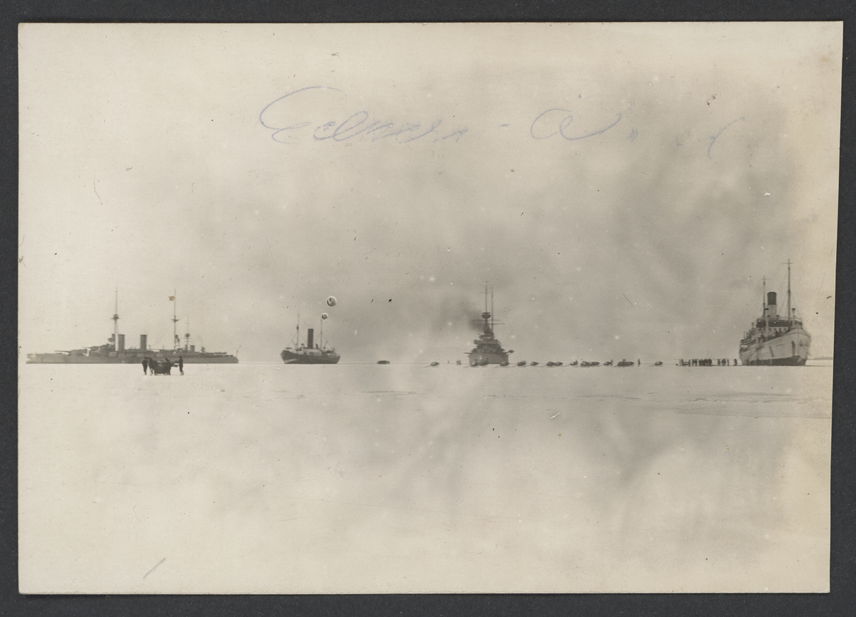 Bilden visar fartyg fastfrusen i isen framför Åland.