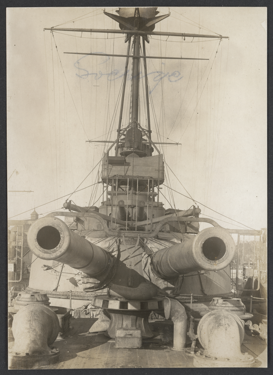 Bilden föreställer en vy över däcket och kanontorn på pansarskepp Sverige framifrån.