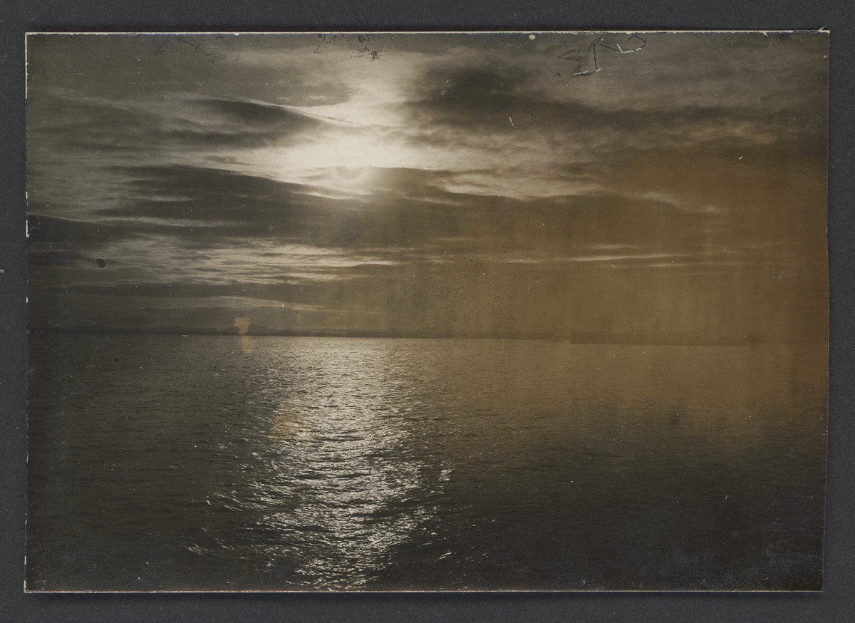 Bilden visar en ljusstämmning med motljus från solen som speglas i havet. I bakgrunden syns kustlinjen och ett fartyg.