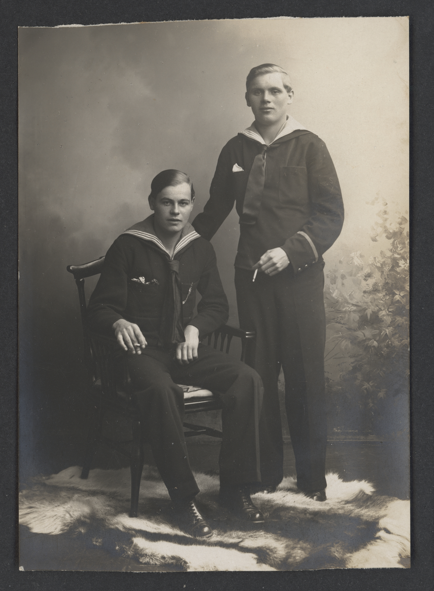 Bilden föreställer en ateljéporträtt av två okända sjömän som röker cigaretter.