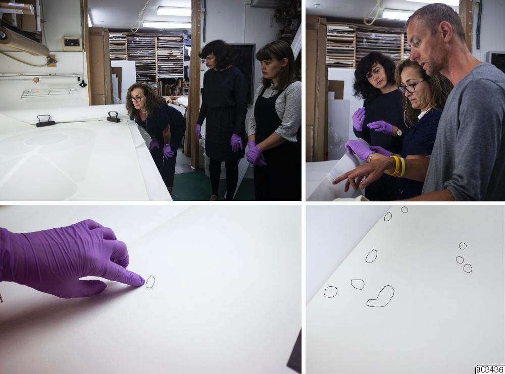 Konservator Farzaneh Bagherzadeh gör tillståndsrapporter för Göteborg International Biennial for Contemporary Art 2017. Produsent Ioana Leca, Iris Bengtsson assistens, Kållered Ramlist. Markering är gjord digitalt för att påpeka märken i pappret.